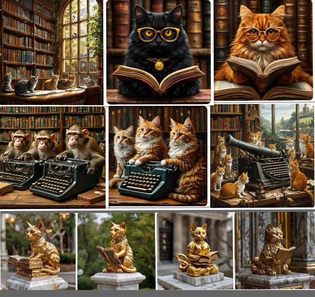 Он собрал своих учеников и неофитов, посадил в аудитории, и поставил перед каждым из них пишущую машинку, велев просто молотить лапами по клавишам и не смотря на то, что литеры выбивали на бумаге сущую белиберду, стал ждать результата, громогласно об этом объявив. Мурлыка кстати за прилежание был допущен к печатанию и сборке готовых работ.