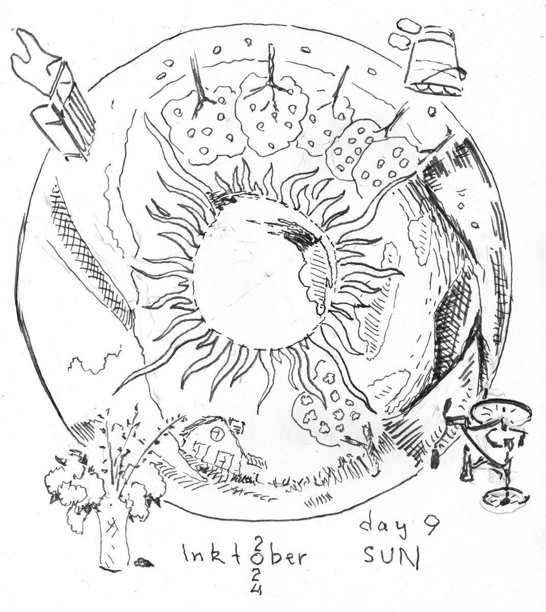 Поэтому тему девятого дня ИнкТобера изображу прямо: так как оно на самом деле и есть. Солнце светит нам всегда, независимо от времени года, суток и погоды. И в самую жуткую жару, и в самый лютый мороз Солнце, сколько бы мы его не ругали, продолжает светить все так же, даря нам тепло, свет и