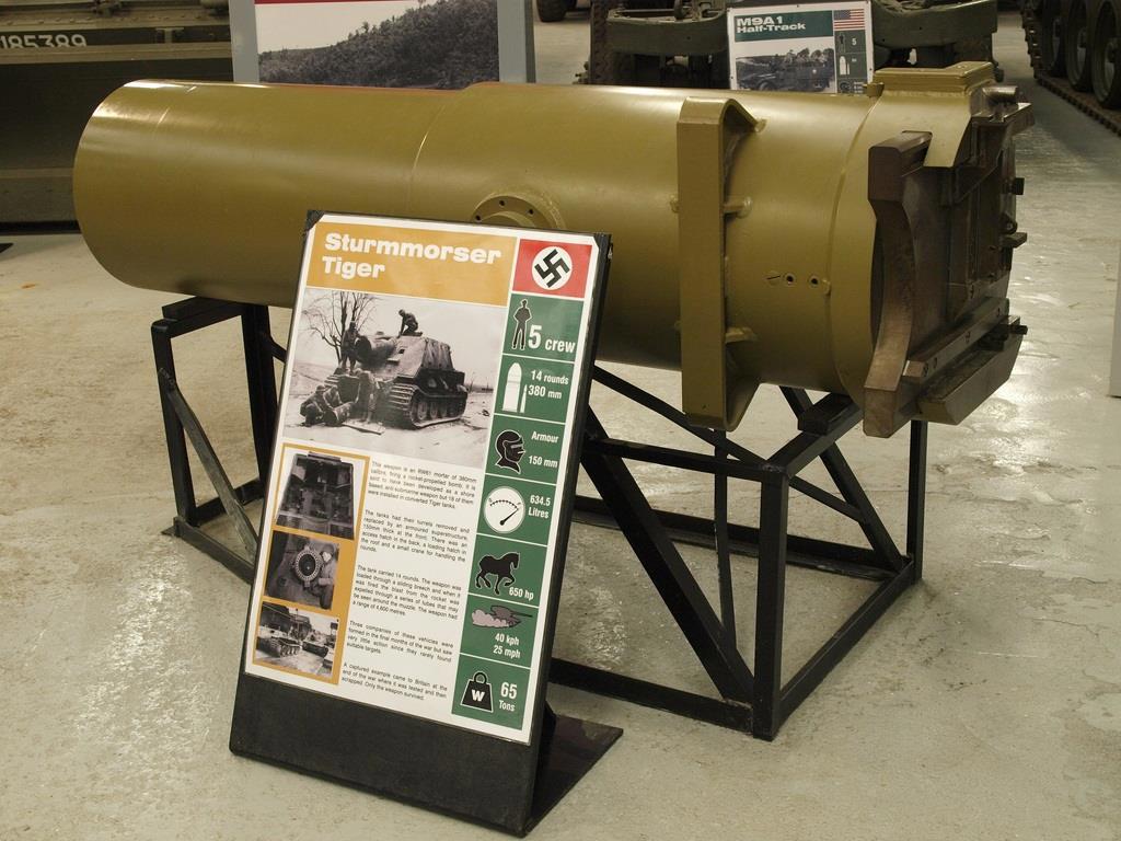 Sturmtiger был  вооружён 380мм. заряжаемой с казённой части  короткоствольной мортирой  Raketenwerfer 61 L/5.4, которая стреляла на  близкое расстояние  (4600-6000м.) огромными ракетными снарядами большой  разрушительной  мощности. Это орудие было разработано компанией  Rheinmetall-Borsig на  основе морской установки запуска глубинных бомб.  Для локальной обороны  на передней бронеплите устанавливался 7,92мм.  пулемёт MG34. Sturmtiger  был способен уничтожить любое здание или другую  цель с одного выстрела.(с)