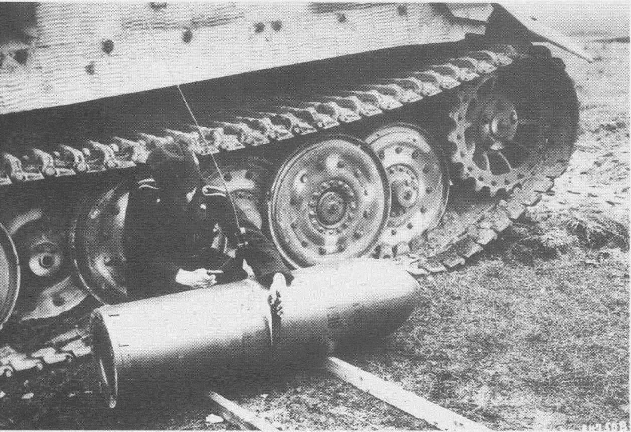 Правда,  боезапас его составлял всего 14 реактивных снарядов (весом  345-351кг.  каждый). 12-13 снарядов хранились на специальных подставках  внутри  надстройки и 1 в стволе мортиры. Машина была оборудована ручным  краном,  помогавшим производить зарядку мортиры. Для этой операции  требовались  усилия всего экипажа. 12 августа 1944 года прототип  Sturmtiger был  отправлен в польский город Pruzshkow, а затем в Варшаву  для помощи в  подавлении восставшей Польской Народной Армии. Один из  неразорвавшихся  снарядов Sturmtiger сегодня можно увидеть в экспозиции в  музее Wojska  Polskiego в Варшаве.