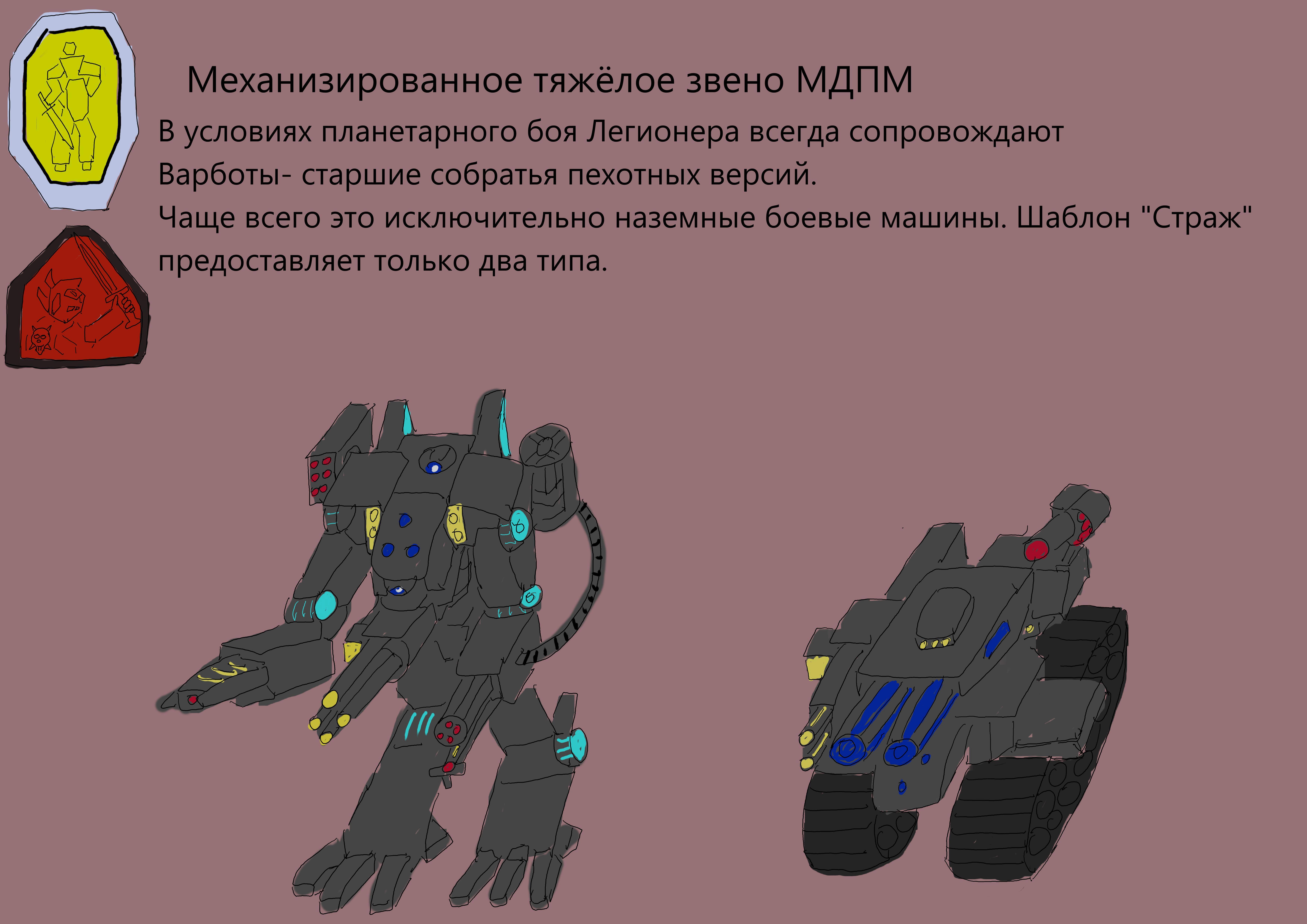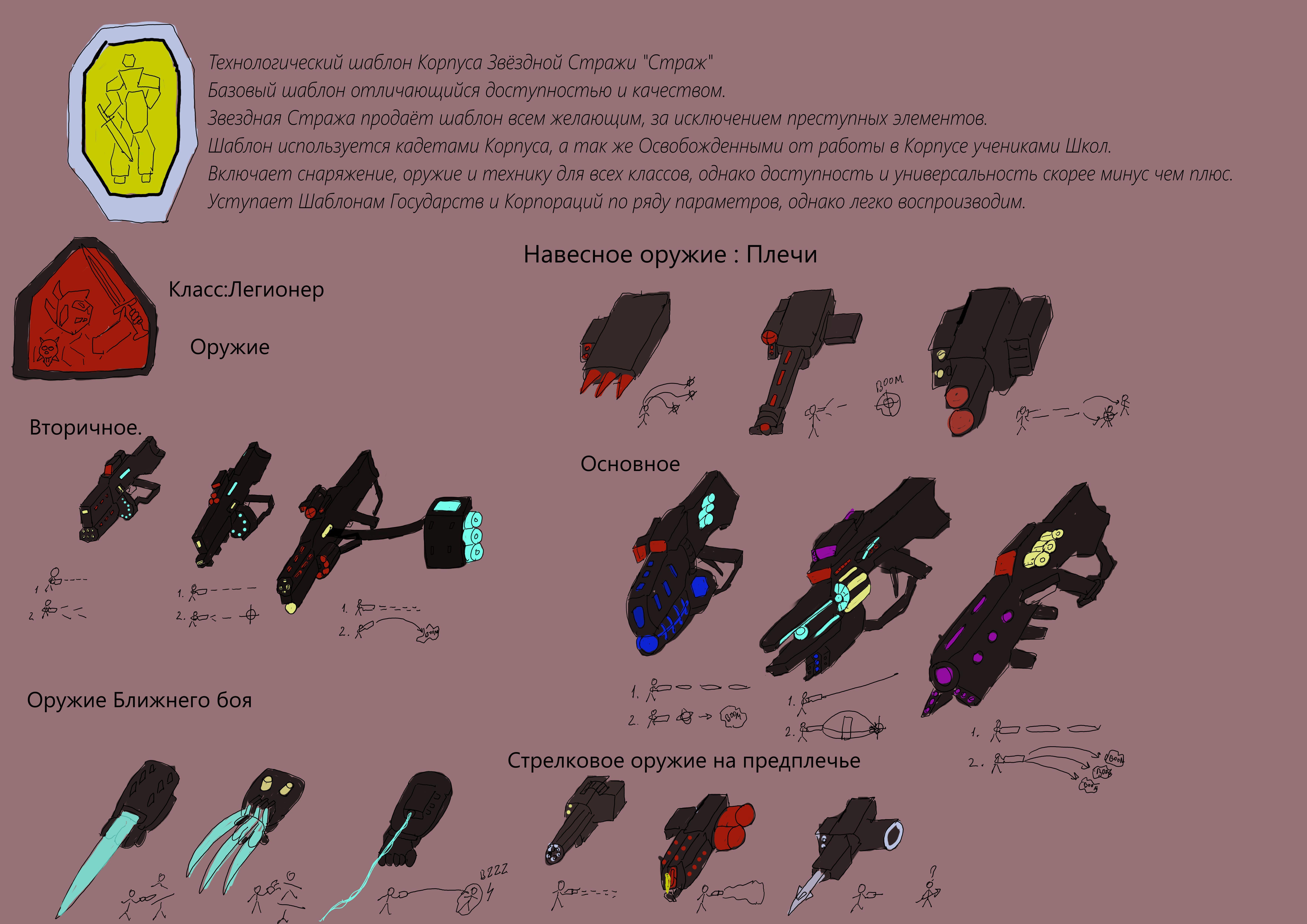 Легионеру доступна боевая техника. Мультикомпонентный доспех повышенной мобильности, состоит из основного Торса отвечающего за энергообеспечение и базовые боевые функции. Манипуляторов- рук для использования основного и вторичного оружия, ног с модулем расширенной подвижности в виде роликовых колёс и рюкзаком с основными подсистемами и тактическим вооружением. В серии артов рассматривается технологический шаблон "Страж" базовый, универсальный и достаточно эффективный, однако ни чем не примечательный, так же шаблон достаточно скуден на модификации и не менялся вот уже несколько тысяч лет. Однако он доступен всем, хоть государственные и корпоративные образования дают большее разнообразие снаряжения и экипировки. При всей своей эффективности и доступности "Страж" оружие бедных, и то что на класс ниже него - вообще признак маргинала. Но в любом случае даже солам надо с чего-то начинать и паттерн "Страж" который рассчитан на все типы суперсолдат будет отличным началом.
