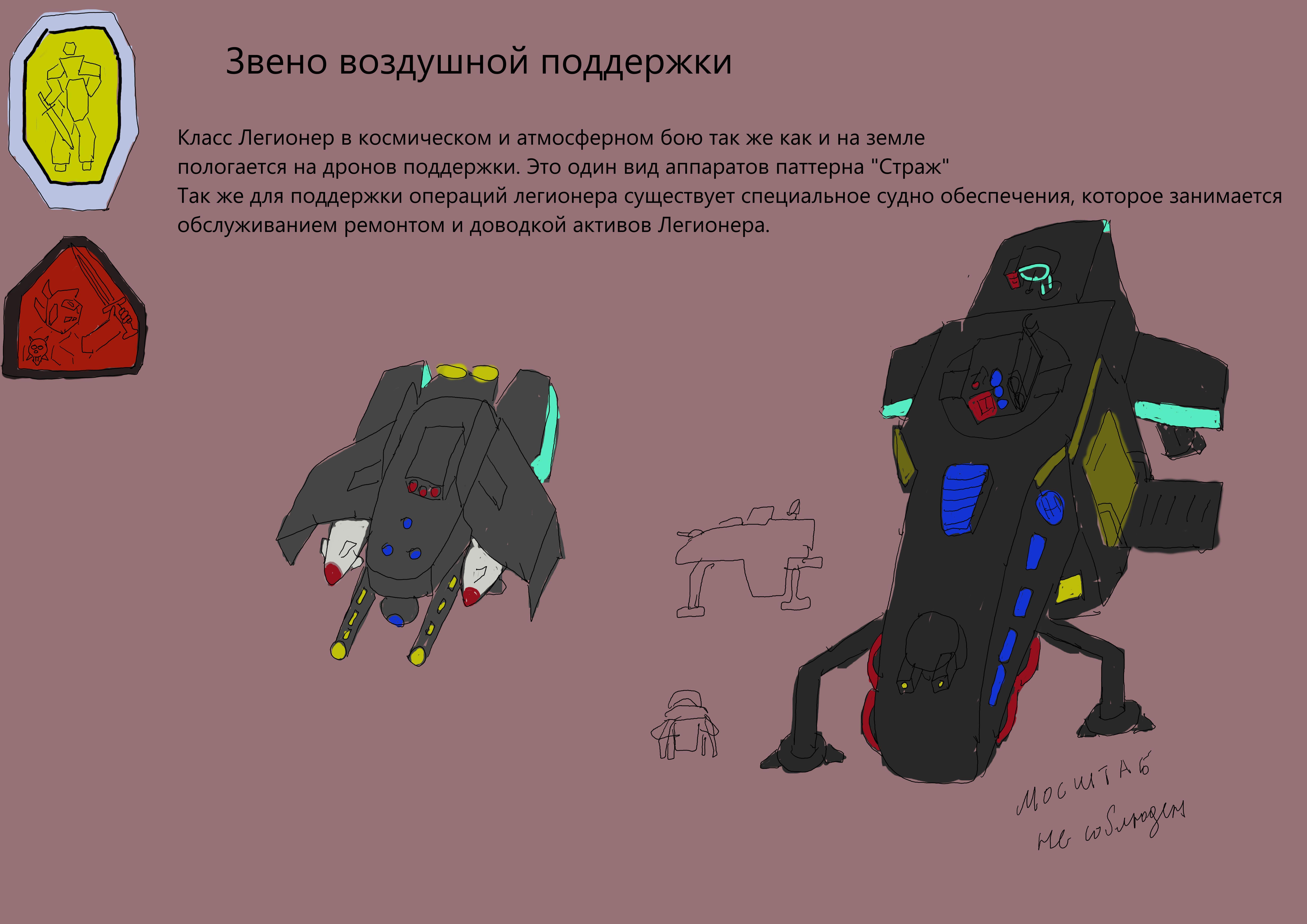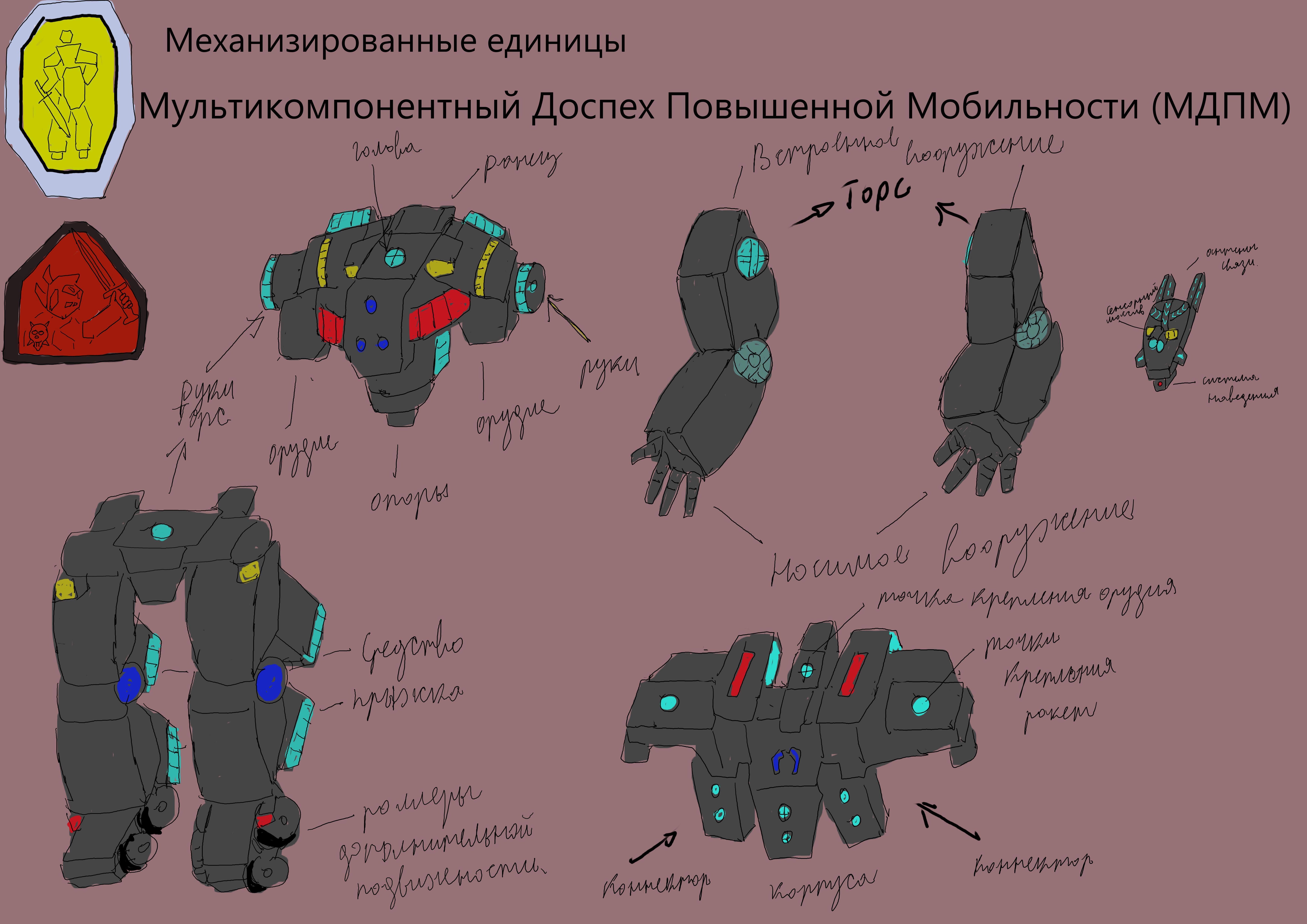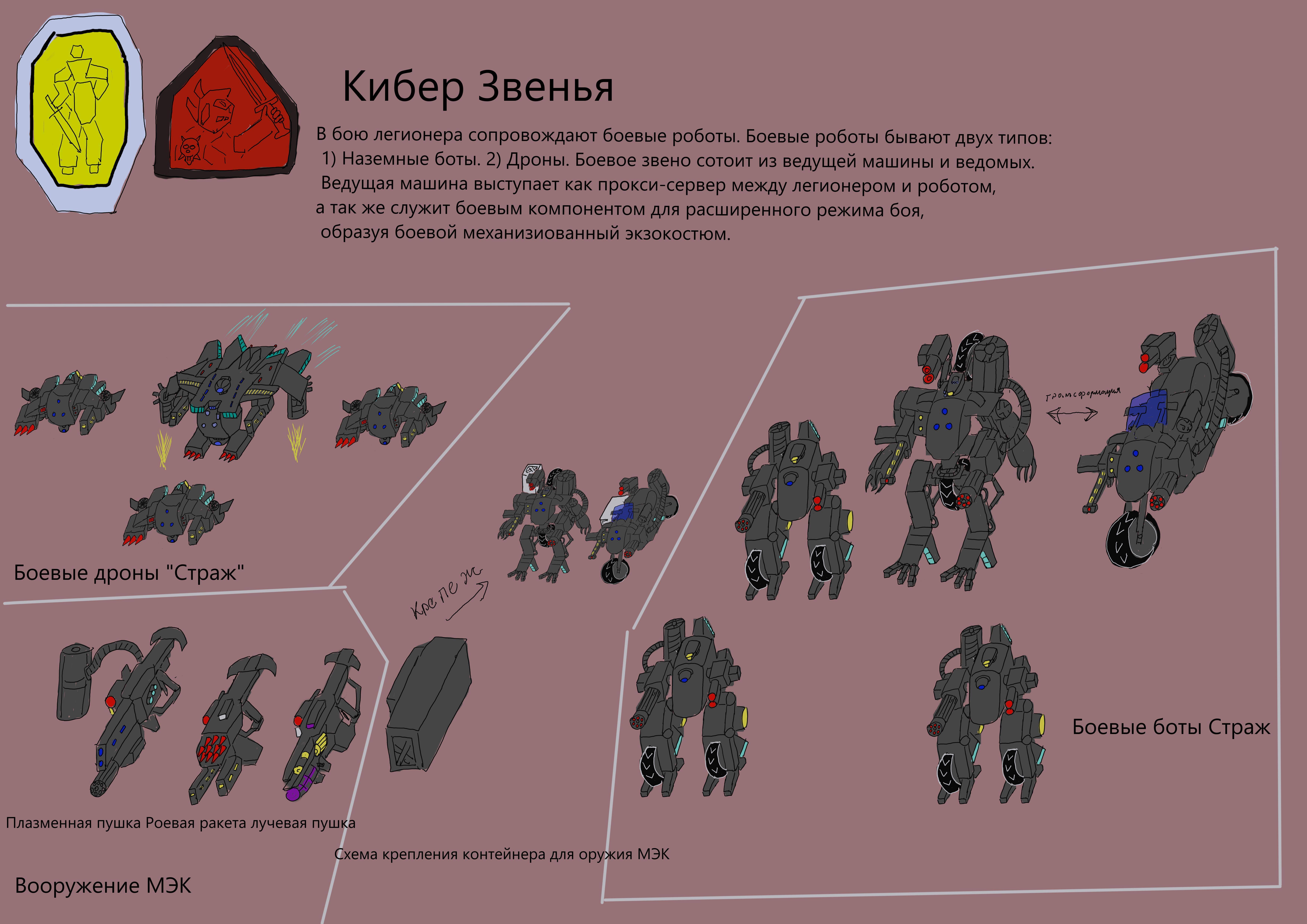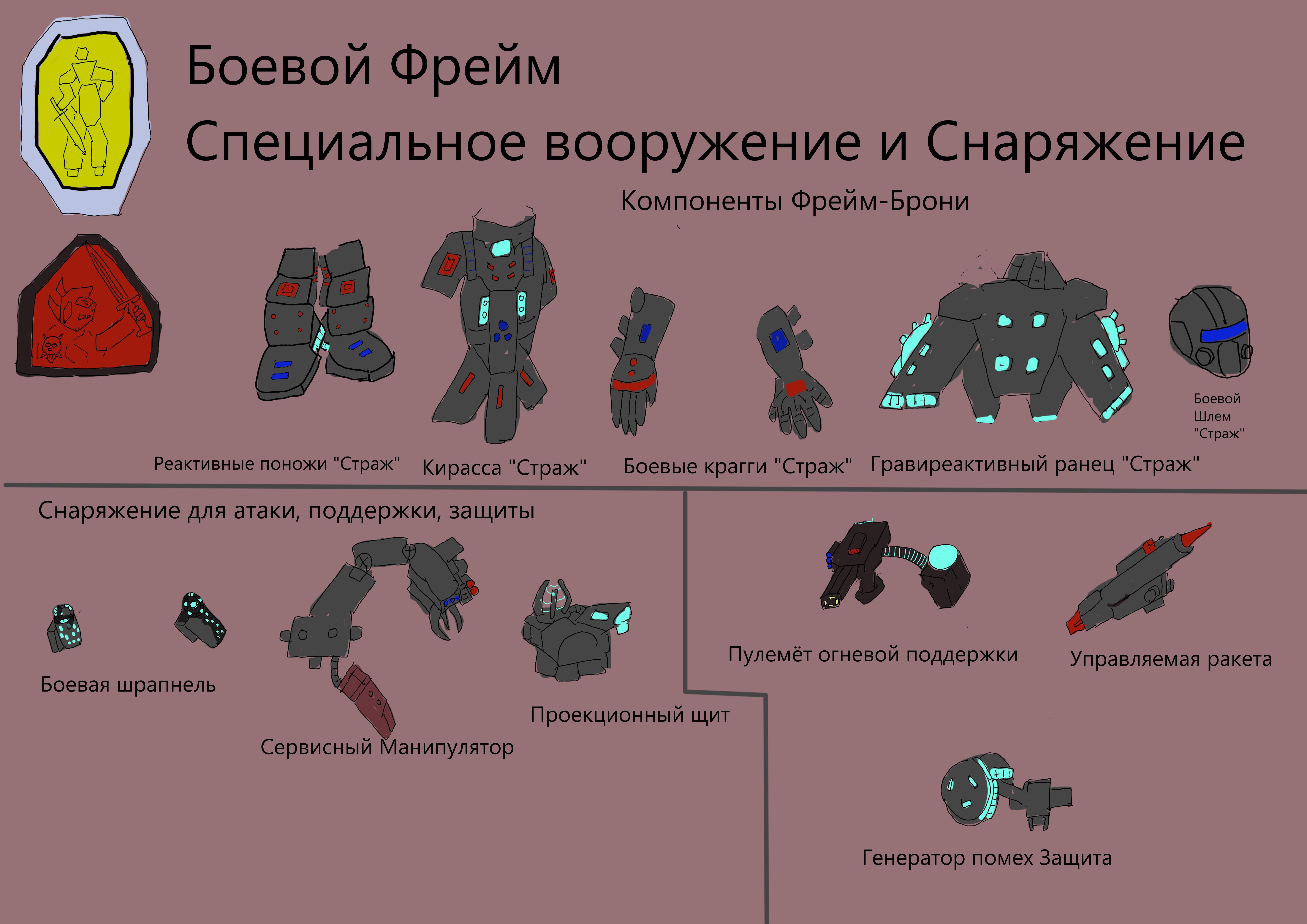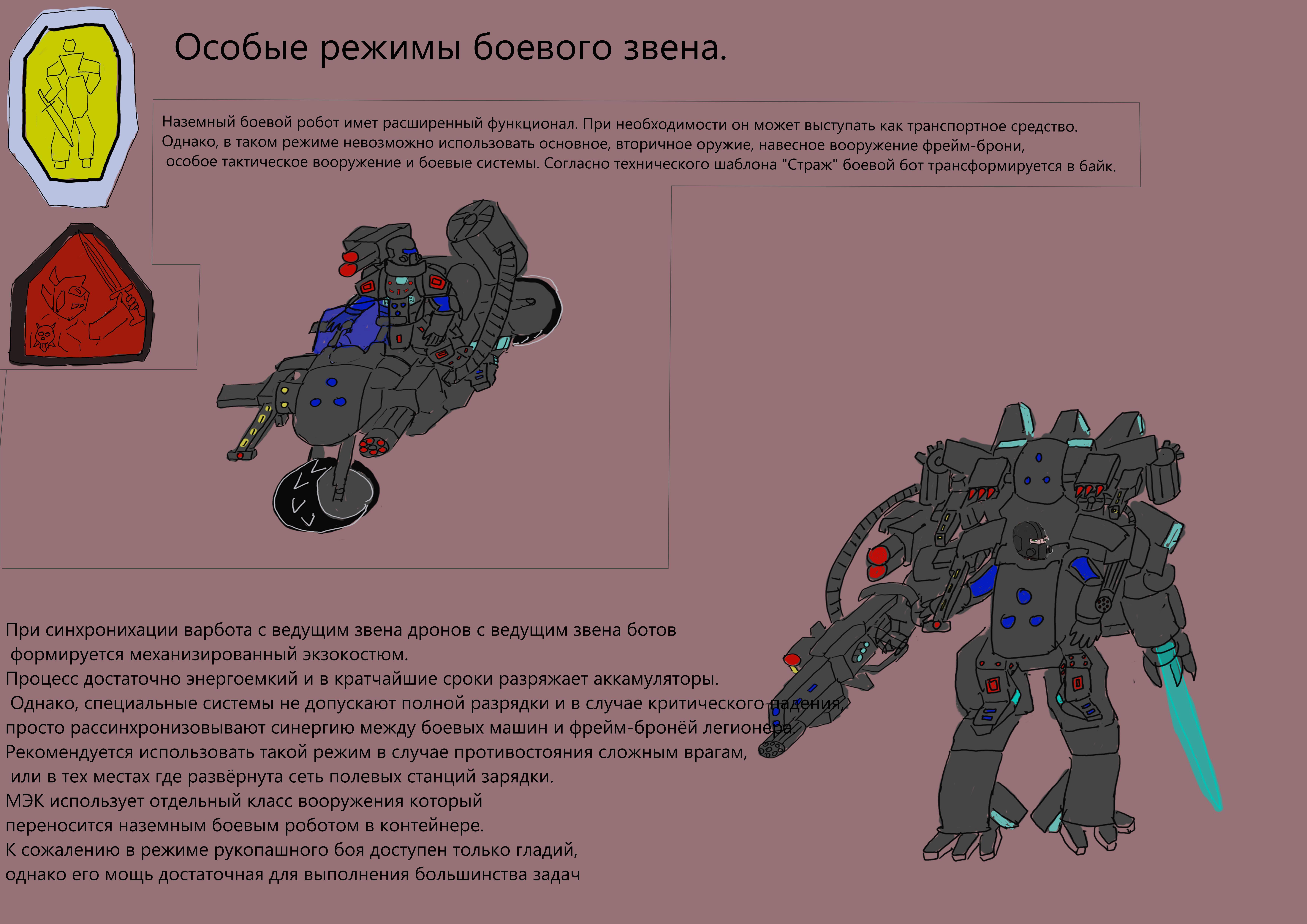 Автор: Гидеон РедмерриНовая Вселенная будет называться "Единство" главными героями в ней будут универсальные суперсолдаты , ("солы"-жарг.мест-е выражение) суперсолдаты относятся к разным школам, с разными боевыми доктринами и вооружением. Суперсолдаты Универсального Боевого Стандарта эффективные машины смерти, одинаково хорошо подготовленные и тренированные. Они сражаются как на земле так и в космосе. Обладают навыками управления доступной школе техникой, согласно доктринам школы и тактическим принципам. В данной серии постов будет рассмотрен класс "Легионер". Легионеров готовят с пелёнок. в них устанавливают саморазвивающиеся зародыши комплекса имплантов, которые растут вместе с будущим суперсолдатом этого класса. Легионер несравненный воин по части техники и технологий. Он обладает инженерными, хакерскими и навыками пилота. В качестве личной экипировки он использует фрейм броню. Модульную боевую систему с возможностью гибкой настройки. Основным оружием является стрелковый комплекс, вторичным- мульти вооружение, в ближнем бою используются плазменные клинки. В бою легионера поддерживают боевые звенья роботов и дронов. Для передвижения ведущий робот наземного звена может трансформироваться в личный транспорт. В случае крайней не обходимости, наземный бот и воздушный дрон могут образовать с фрейм-бронёй легионера единый боевой комплекс- МЭК. Такой режим работы забирает прорву энергии, по этому действия возможны только на непродолжительное время или в местах где развёрнута сеть полевой зарядки аккумуляторов.