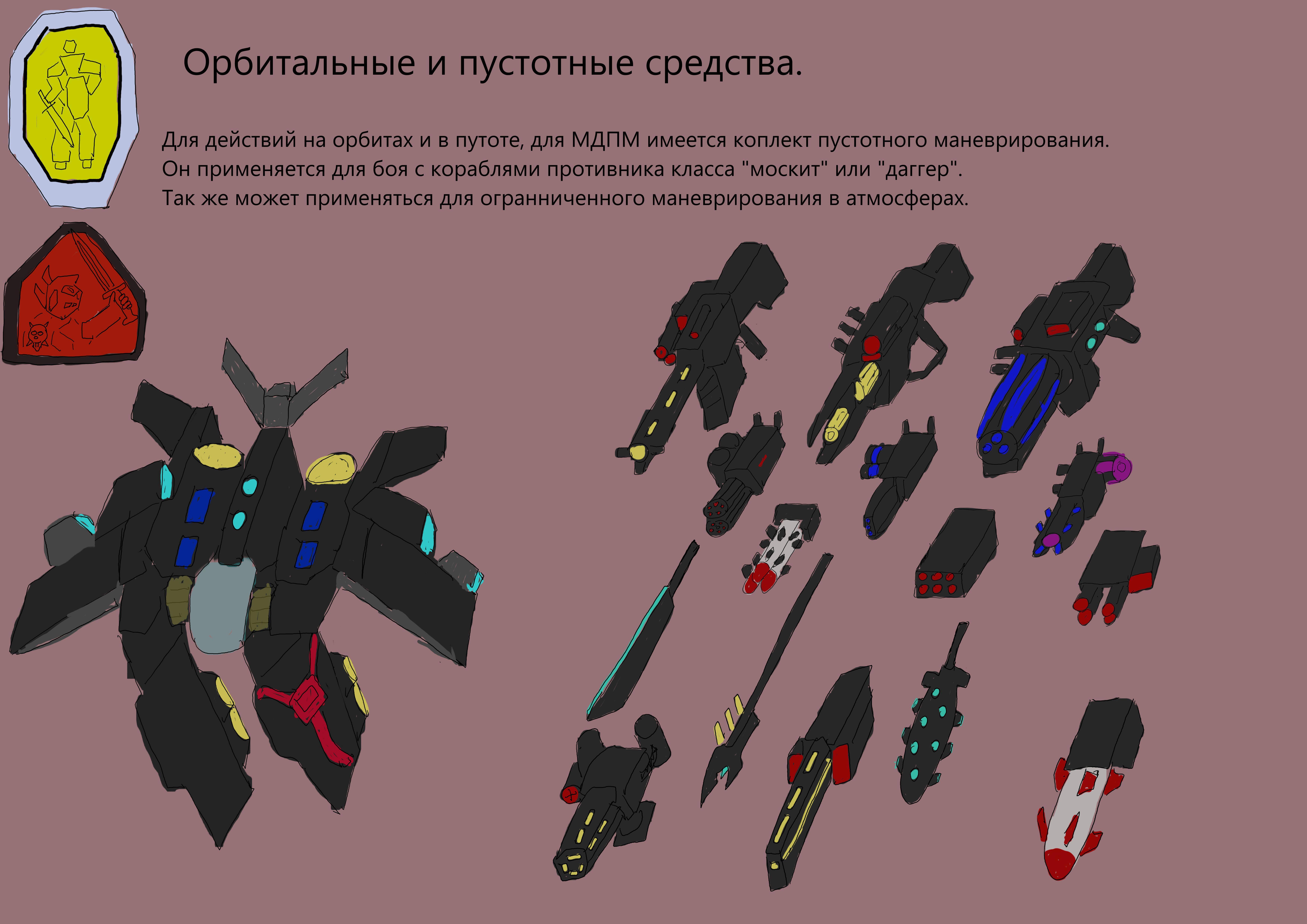 И на конец, для боя в космосе МДПМ использует средство пустотного маневрирования. Данный боевой модуль имеет отдельное оснащение в виде особой надстройки расширяющей возможности для полёта. В случае необходимости или при возможность дозаправки, МДПМ можно использовать с системой пустотного маневрирования и в атмосфере планет, это энергозатратно, но позволит нанести существенный урон вражеским силам. Для поддержки операций в пустоте и на орбитах , боевую машину сопровождают боевые дроны.