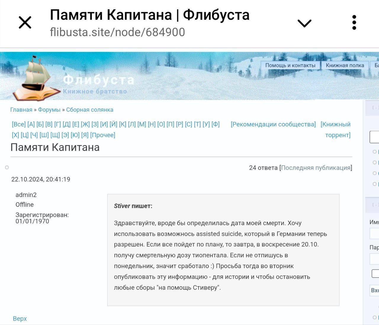 Умер основатель бесплатной библиотеки "Флибуста". Stiver — так звали мецената — решил не дожидаться смерти от рака, которым долго болел, и принял укол смертельной дозы тиопентала.