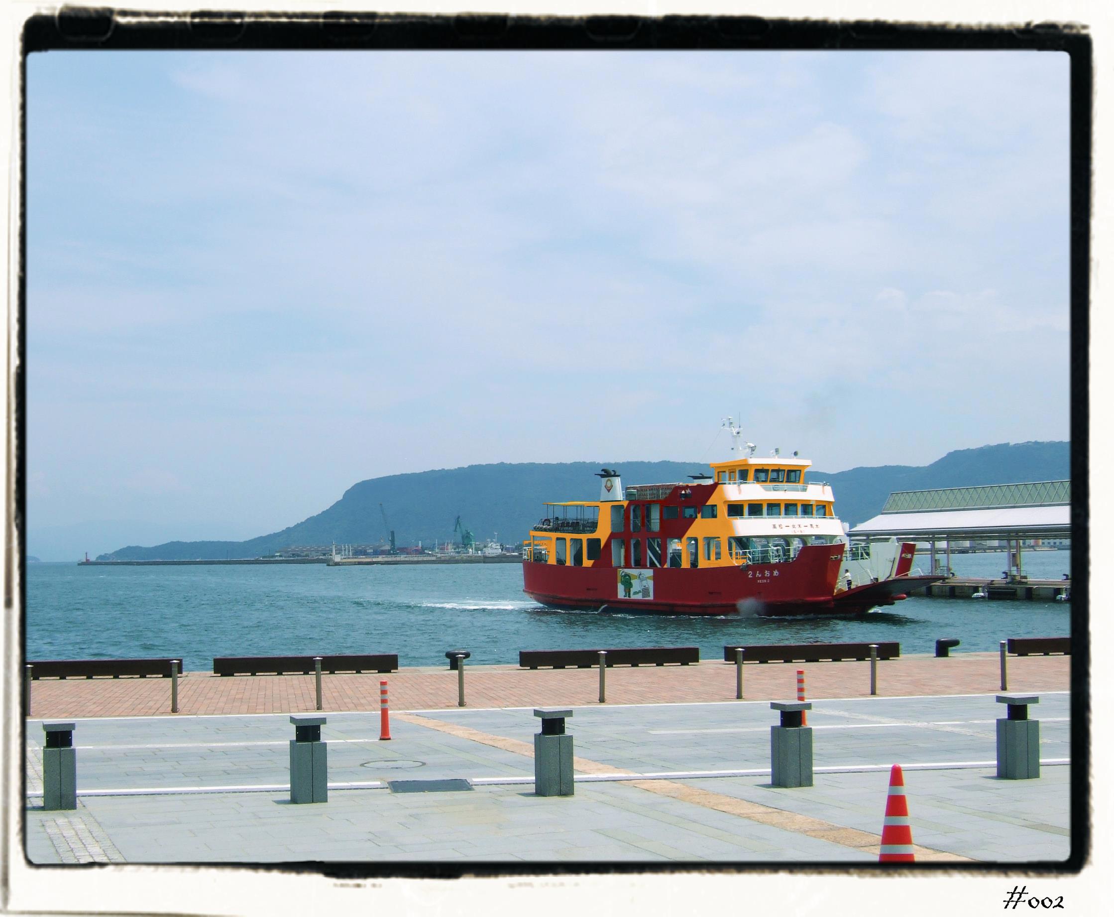 Межгородской это конечно Шинкансен - поезд-пуля*. Насчёт пули не знаю ... хотя на мониторе было 318 км/ч - ощущение от скорости нет. Тихо, спокойно, и очень дорого. Это нам не в новинку - я давно живу по принципу "лучший Дойче Бан - это частный автомобиль". В Японии всё не так линейно, поскольку частная парковка может стоит как чугунный мост. Поэтому микромашинки-кейкары весьма популярны**. Честное слово, мне они напоминают комнату для удобств во фрацузских гостинницах - при чистке зубов в ванной, твоя задница смотрит ТВ в спальне. Шинкансен - быстр, но плавать не умеет. А Япония это страна сотен островов, - поэтому самолёты и паромы. Пароходы - всех мастей, расцветок, и размеров. Годзилла на такой не клюнет - цветовой когнити́вный диссона́нс её сразу прикончит. Меня тоже контузило. На фото - паром который привёз меня на Шодошиму. Через час придёт другой - тоже шедевральной расцветки.