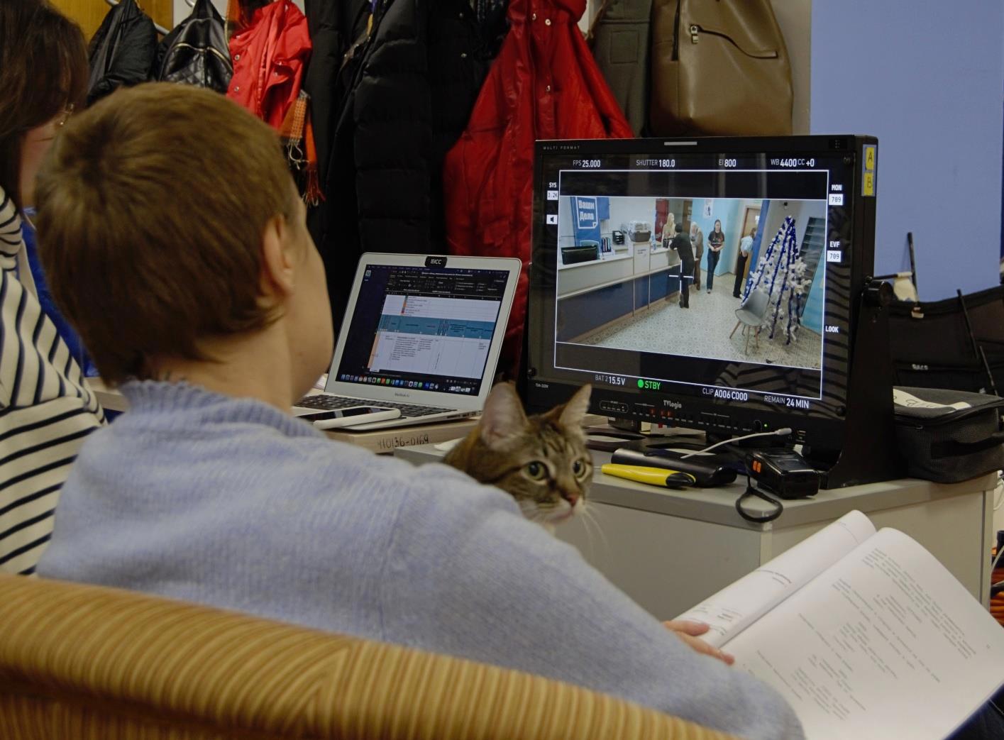 На будущее я поняла, что на репетиции (что с камерой, что без) животных выводить нельзя. Как и детей, кстати. Они влёт перегорают за время ожидания, и естественность при самой съёмке уже теряется. Но это было уже на третьей последней смене, и там от кота вообще ничего не требовалось, сидеть на руках и не сбегать.