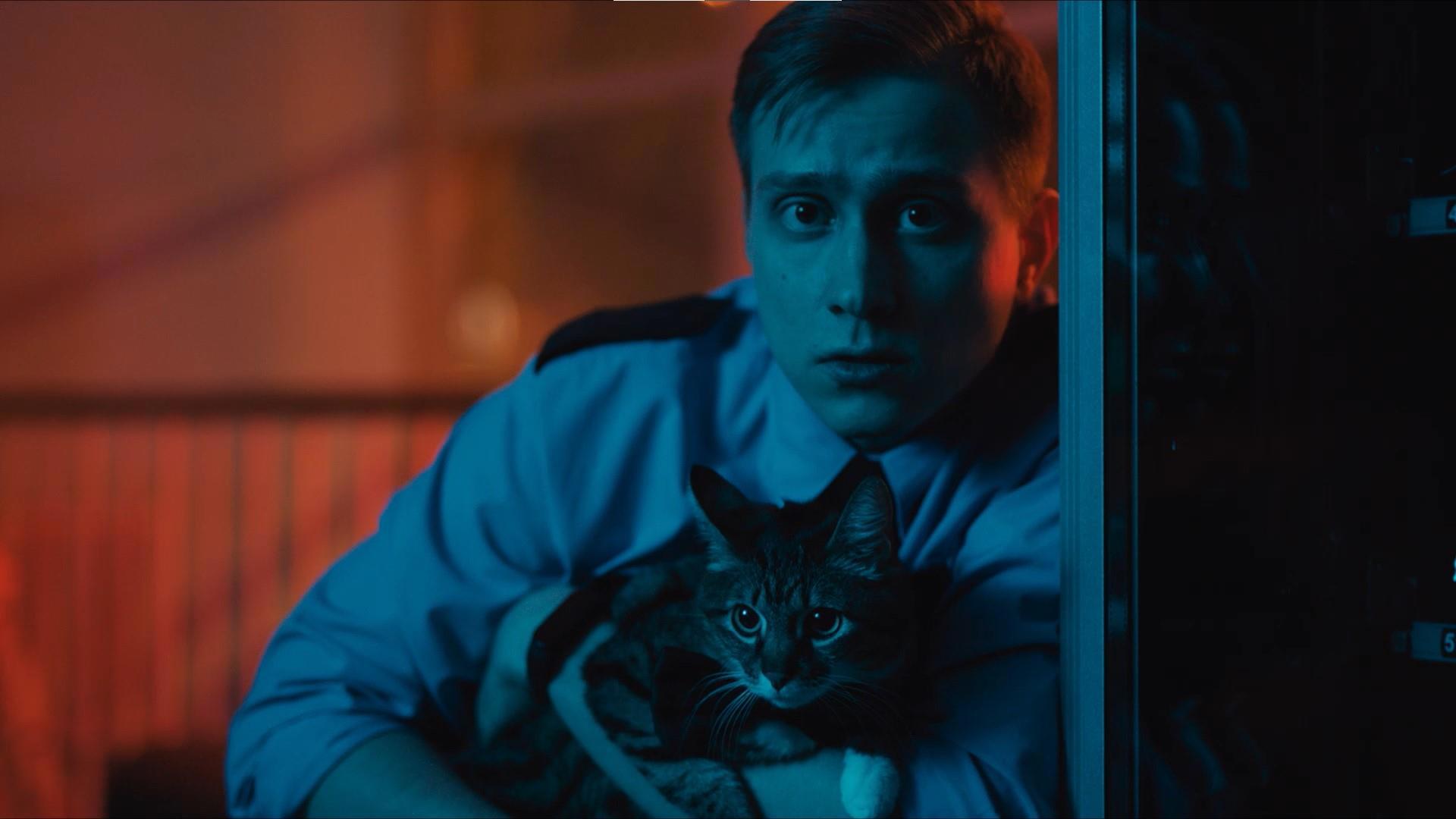 Кадр из фильма "Нормальная такая жизнь" - актёр Антон Вохмин и котик Тирион Илион Сильвио