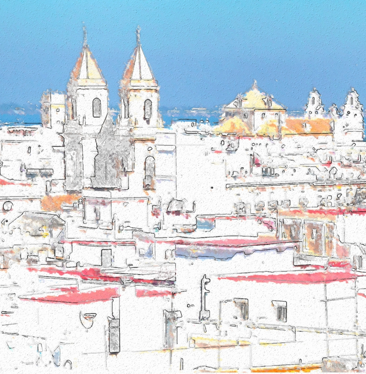 Многие из них осели в Кадисе. Чем знаменит Кадис? Основанный финикийцами в 7 веке до н. э., он считается самым древним городом Западной Европы. Как и стоило ожидать, с тех времён почти нчего не осталось - камни и океан. Я рисовал Кадис много раз. Знаете, что там самое живописное? - башенки на крышах купеческих домов. Из них высматривали прибывающие торговые суда - кто первым успел, тот и рыбку сьел.