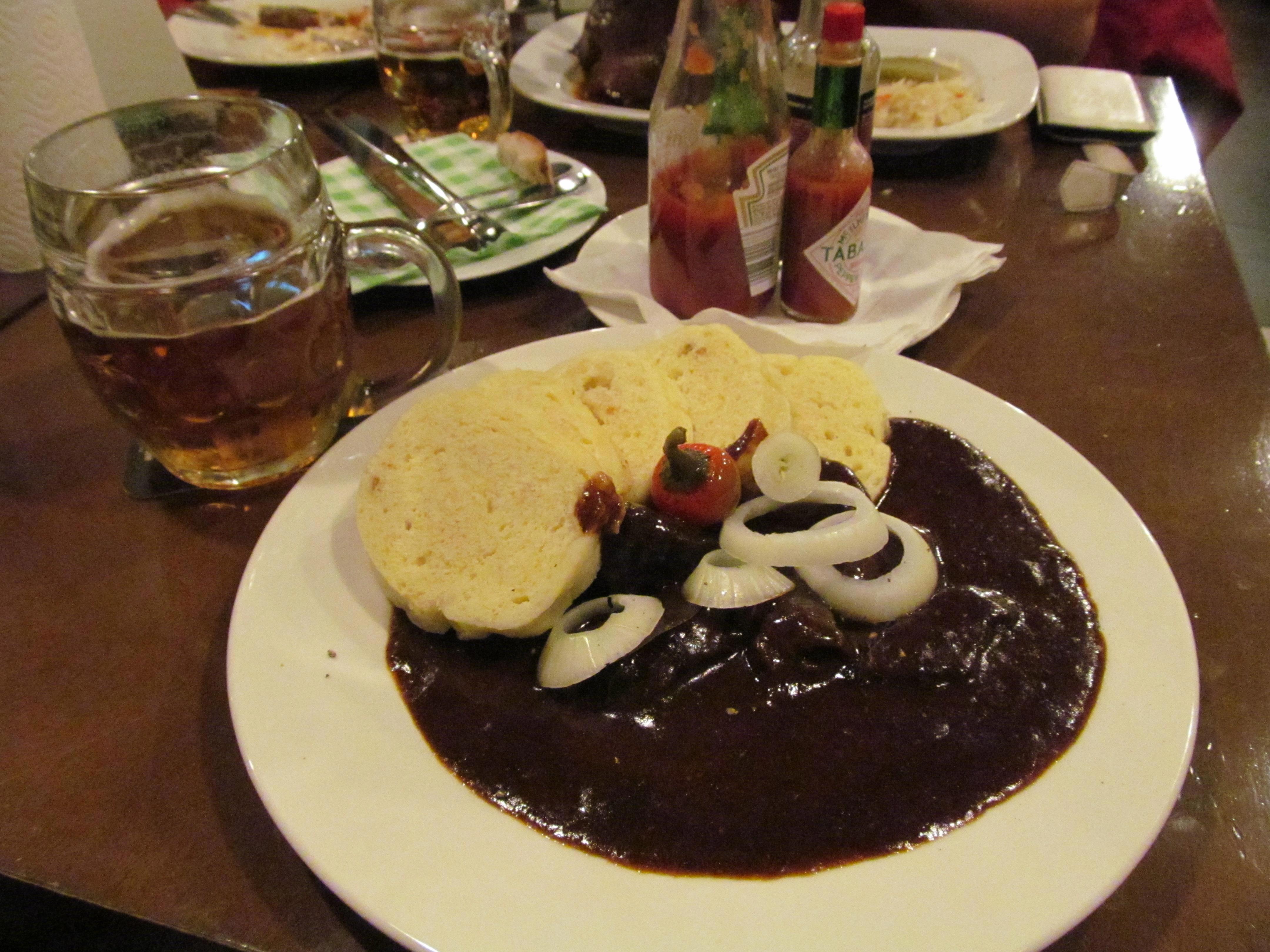 Что же, зашли… Принесли меню на чешском и английском… Кто-то заказал шницель, кто – «вепрево колено», а мы с одним товарищем – «традиционный чешский гуляш с кнедликами». Захотелось вдруг местные блюда попробовать, заодно и кнедлики эти – никогда не ел)…