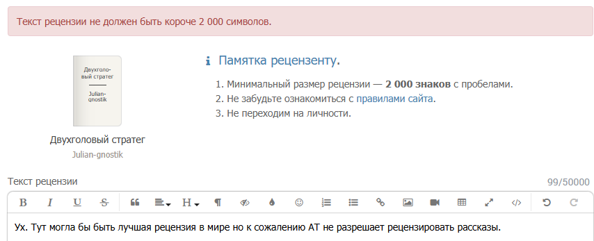 И вуала, можем начать писать рецензию, как видим первая автоматическая проверка это на количество символов.