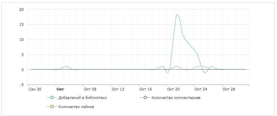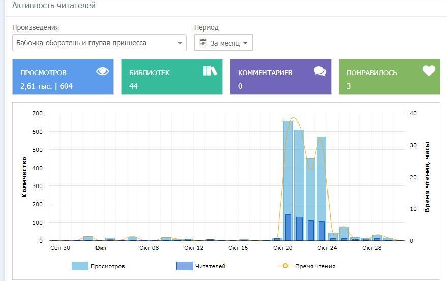 Как видите, кроме "Бабочки"1 было ещё 20 добавлений других моих книг в библиотеки, увеличились просмотры и после окончания действия теста ещё два дня интерес к моей странице был заметно выше обычного. Потом эффект ушёл.