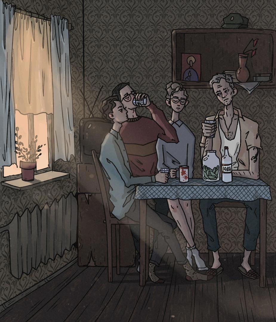 Автор: Мария ПотоцкаяБогически стильная рисовка иллюстрации от chepuhart, конечно же, к моему Автопортрету с отрезанным ухом. На ножки, лица персонажиков, обстановку комнаты можно любоваться вечно, как по мне. И свет, пролитый на окружающую безысходность, все, как должно быть в книге.))