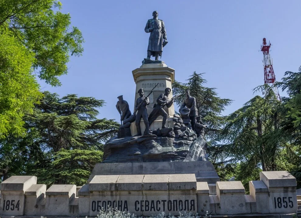 Во время Великой Отечественной Войны снарядом оторвало голову фигуре Тотлебена. После освобождения Севастополя памятник восстановили, отлили новую голову, торжественно установили и тут выяснилось, что на голове у генерала фуражка... И всё бы хорошо, но такая же фуражка у него в руках. Не обратили внимания, торопились. Пришлось отливать голову заново.