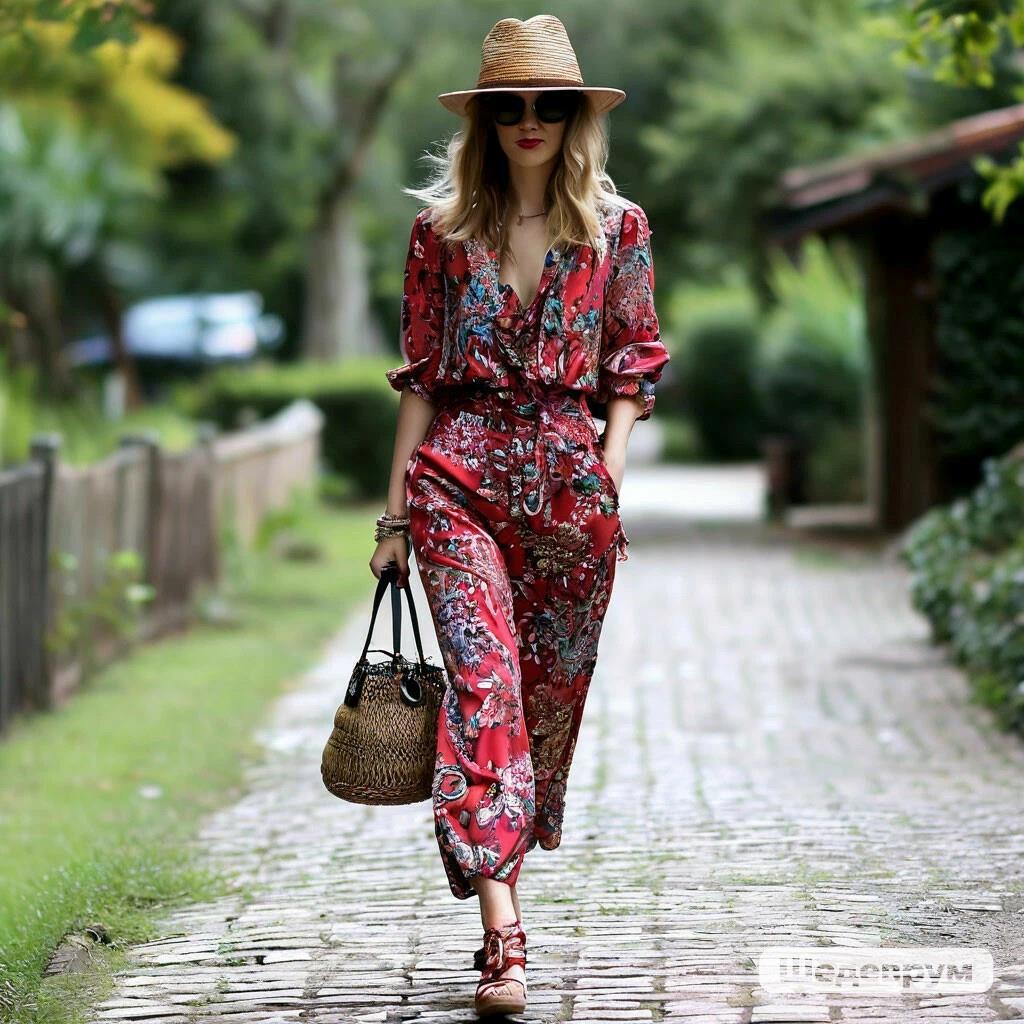 В бикини, шляпке и сабо.