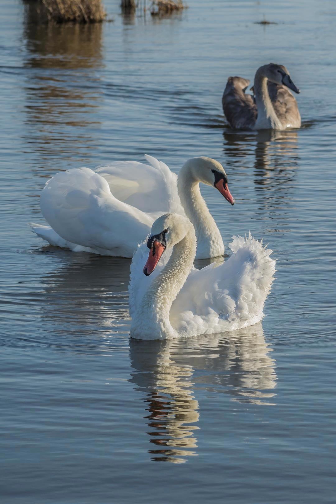 Взрослые лебеди и молодой лебедь. Фото Сергея Малышева.