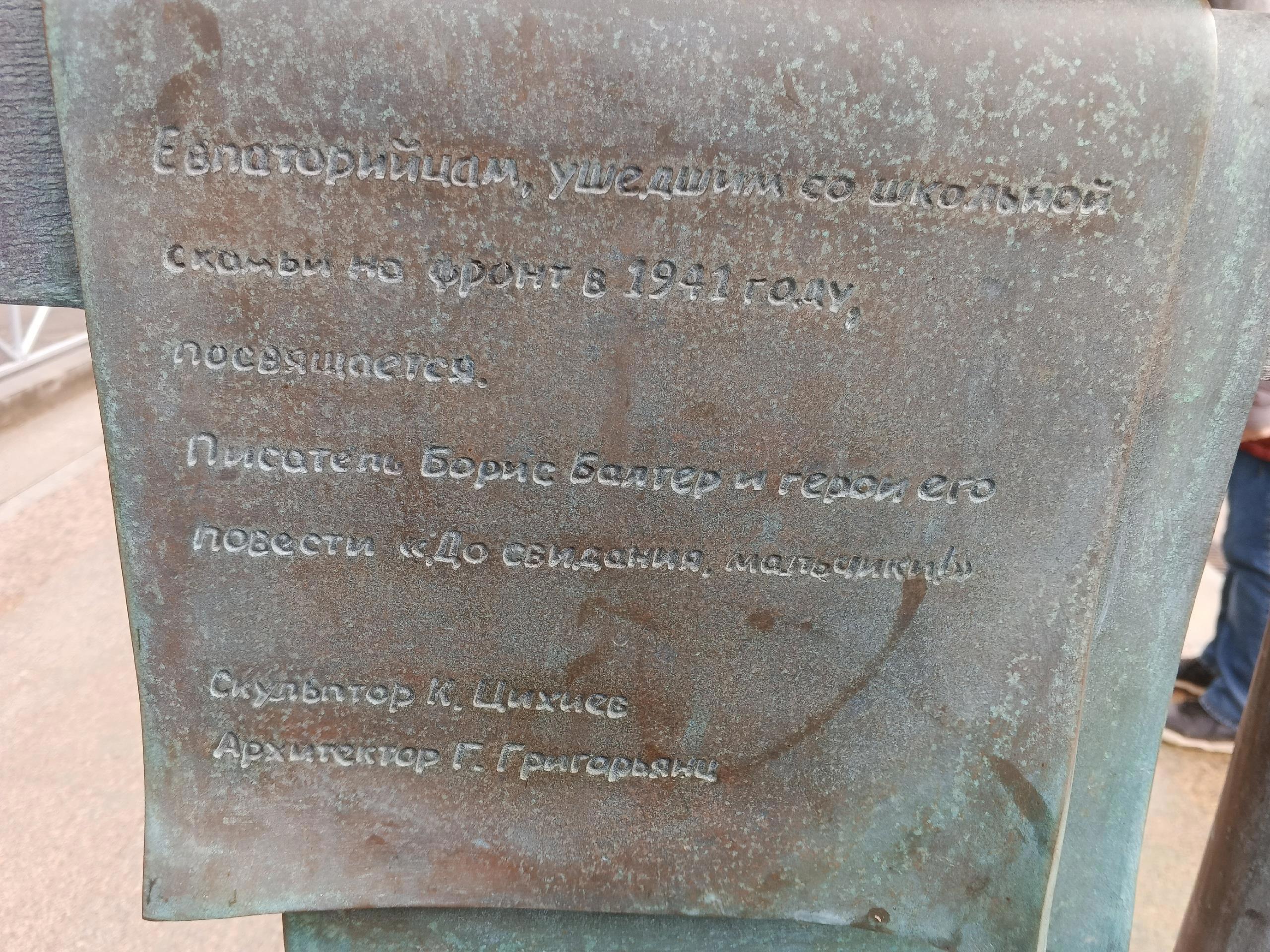 А на самой набережной встал новый прекрасный памятник. В бронзе застыли герои книги известного писателя Бориса Балгера из книги "До свидания, мальчики!" Памятник посвящён евпаторийцам ушедшим на фронт сразу со школьной скамьи.