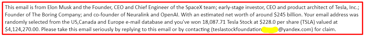 Ваш адрес электронной почты был выбран случайным образом из базы данных США, Канады и Европы, и вы выиграли 18 087,71 акций Tesla по цене $228,0 за акцию (TSLA) общей стоимостью в $4 124 270,00.