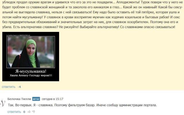 В повести (её авторшу, оказавшуюся психопаткой, хамкой и агресивной стервой уже отправил в Ч.С., поэтому ссылку на повесть не даю) мусульманин-Турок был влюблён в славянку. Она была преступницей. Воровала и т.д. Он всё знал, но её не выдавал. Спас её от изнасилования пятью мужчинами. Она его убила ножом в глаз (убрала свидетеля знавшего о её преступлениях). Она - славянка живущая за границей. Я думал что автор - мусульманка (литературный герой Турок упоминал Аллаха). Поругал злодейку. Ответ показывает насколько некоторые славянки агресивные и хамовитые. Женитесь на мусульманках!