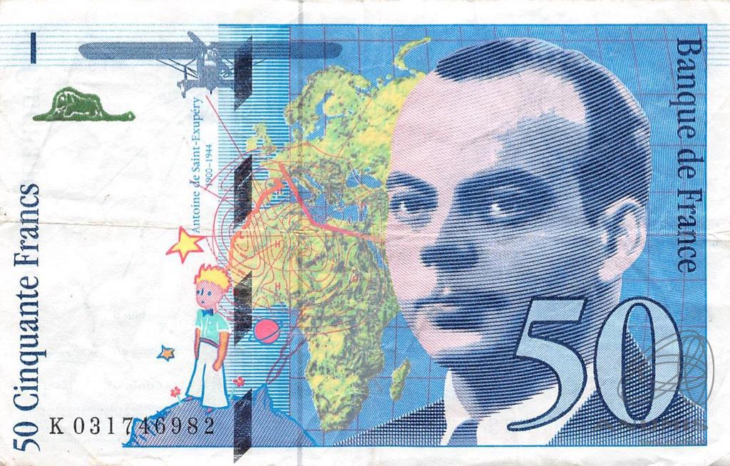 Пятидесяти франковую купюру занимает Антуан де Сент Экзюпери -известный автор «Маленького принца». Путь летчика – это не осознанный выбор третьего сына виконта Жана де Сент-Экзюпери и его супруги Мари де Фонколомб. Изначально он планировал стать моряком и проходил подготовительный курс Военно-морского лицея Сен-Луи в Париже, но не прошел по конкурсу.