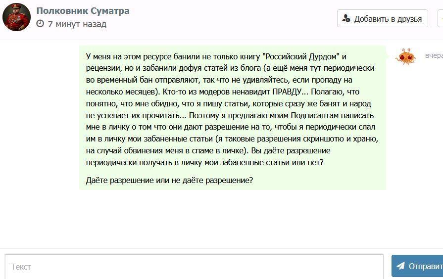 - - нафуй нужно такое уйопище среди ровных подписчиков согласивших получать в личку рассылки забаненного?! Занести его в Ч.С.!