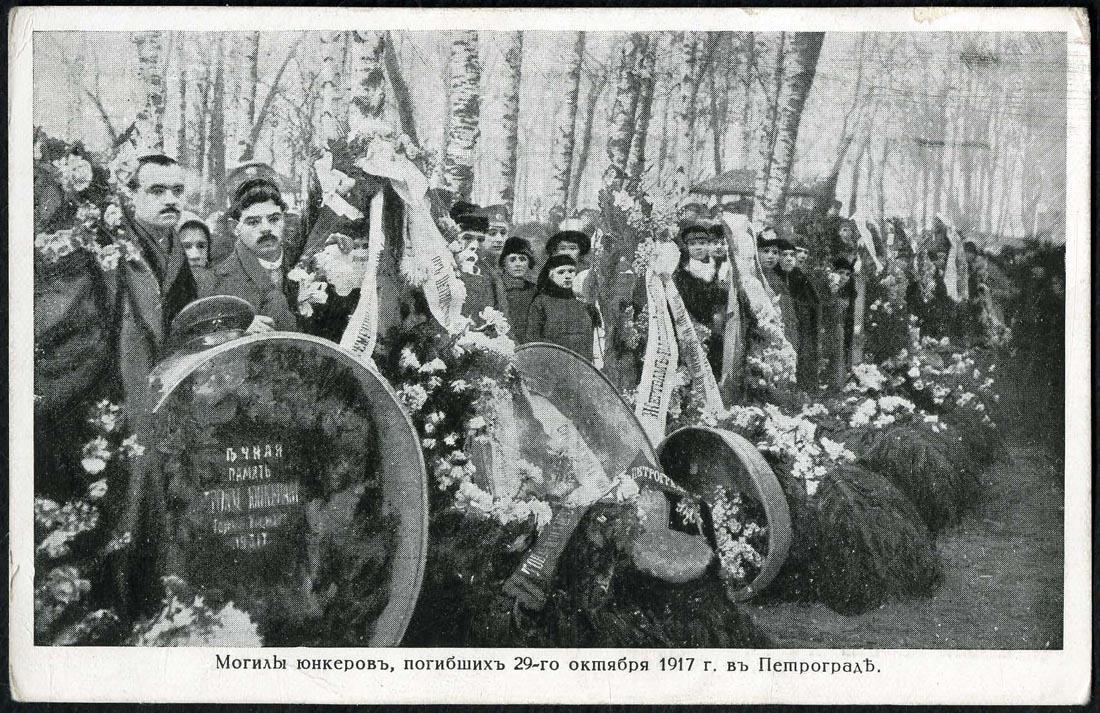 “За последние дни петроградская еврейская община оплакивает свои многочисленные жертвы, как в дни еврейского погрома, — сообщалось в заметке “Похороны евреев-юнкеров”, опубликованной в петроградской газете “Вечерняя почта” 6 ноября 1917 года, — На еврейском Преображенском кладбище за один день похоронено 50 жертв. Среди похороненных 50 юнкеров, убитых при осаде Владимирского училища и телефонной станции”.