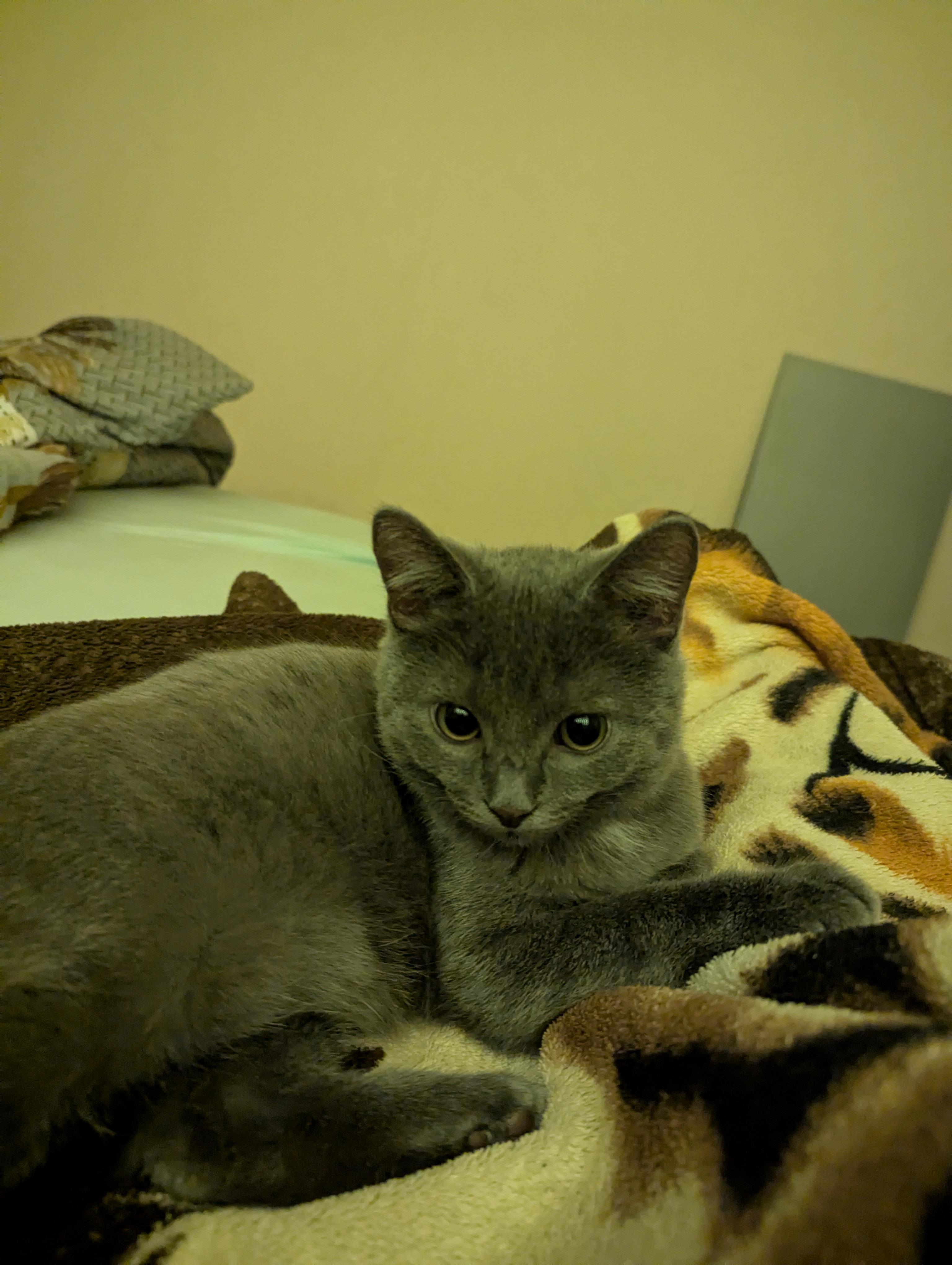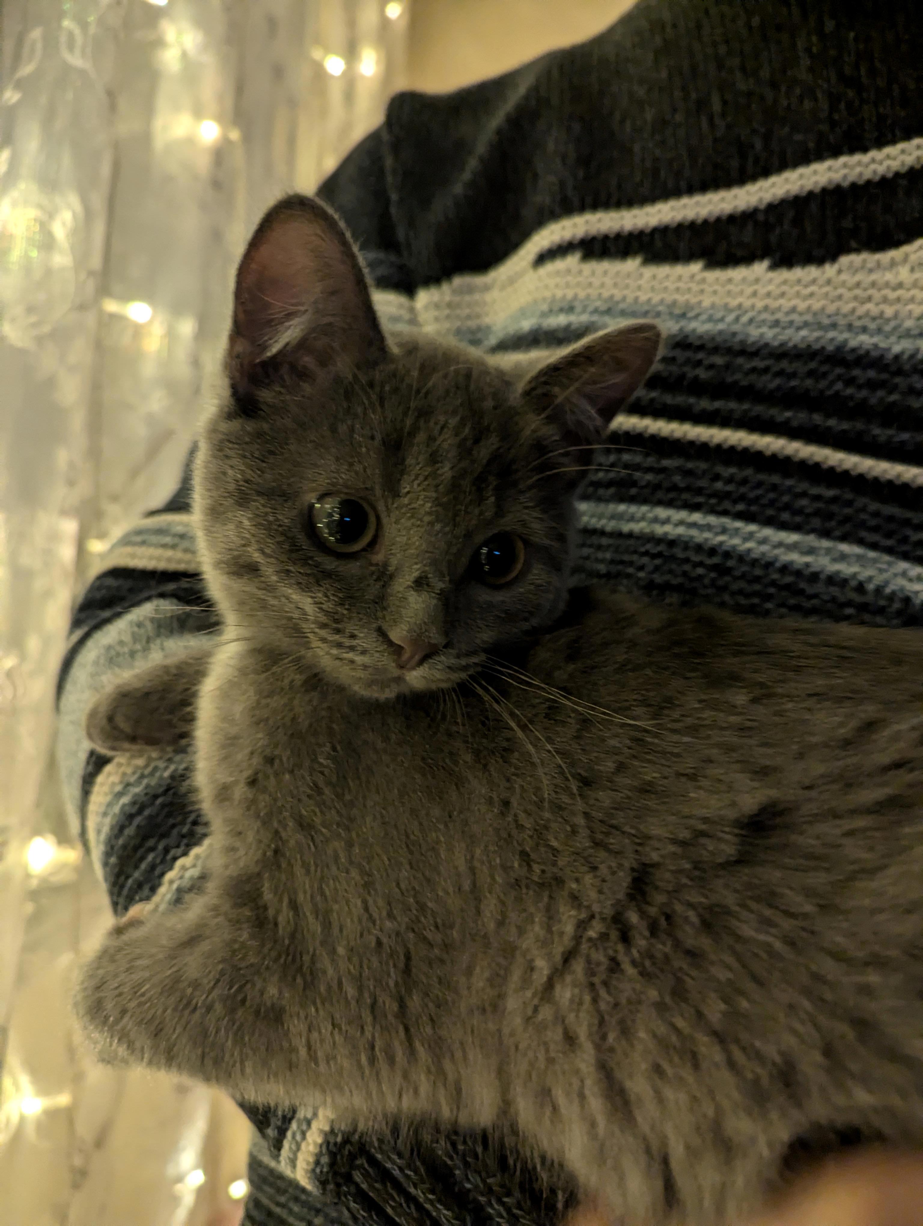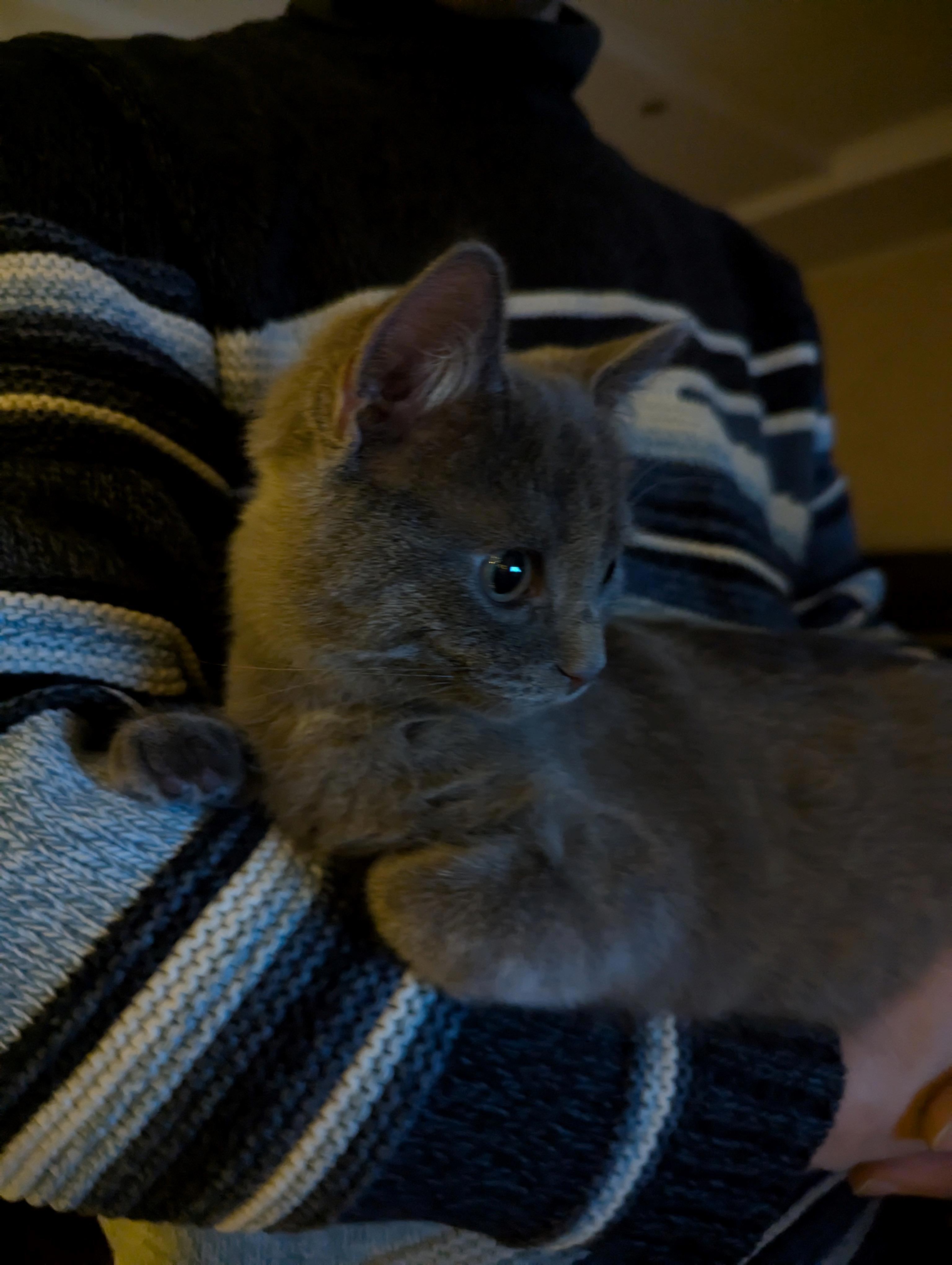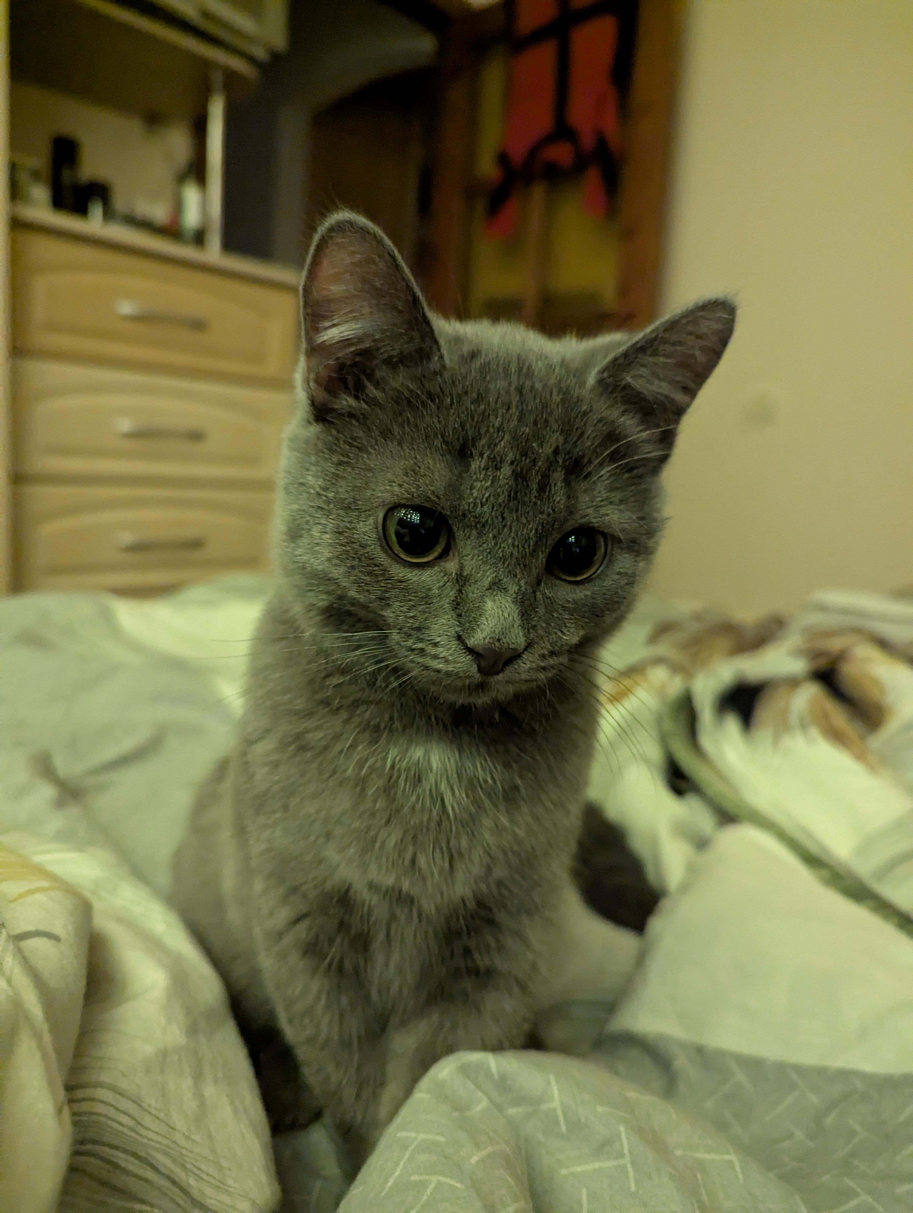 Котей подрос, ориентировочно ему 3 месяца с хвостиком. Картинка со звуком - мурчальный аппарат работает на полную мощность.