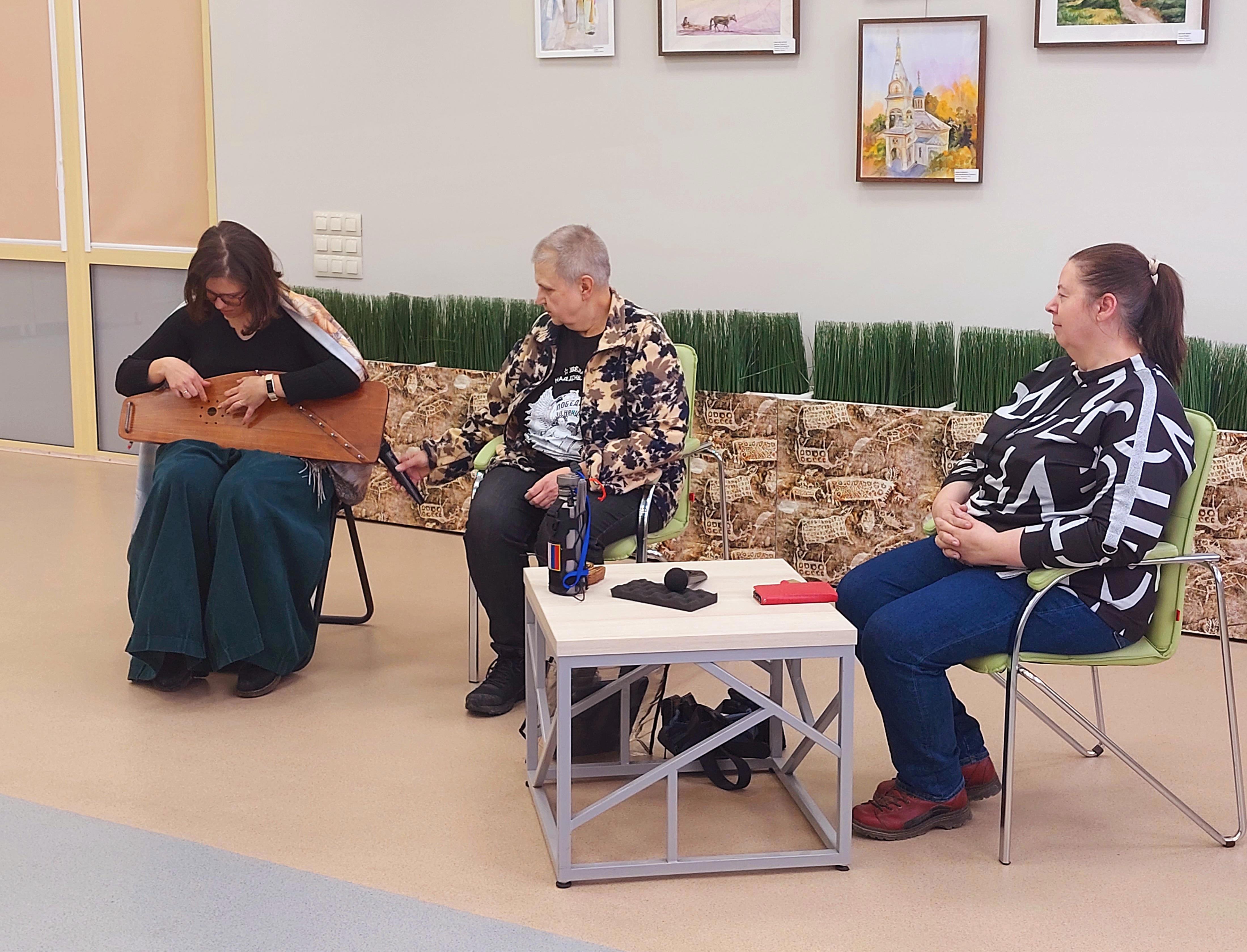 Чтобы поддержать Марию Васильевну из Новосибирска приехала молодая писательница Елена Абрамкина, которая привезла свои личные гусли и сыграла на них несколько народных песен. Мария Васильевна в свою очередь ответила ей соло на камузе (варгане).