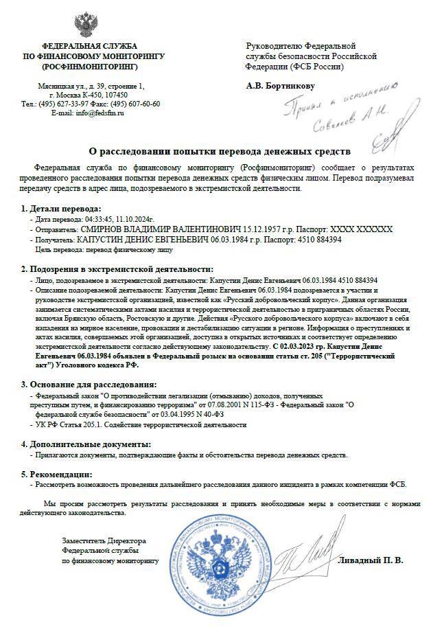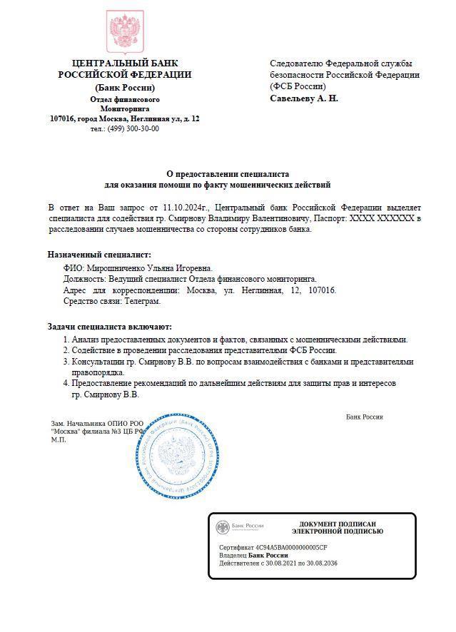 сообщил, что с моего счета была попытка перевода средств экстремистам, прислал скан постановления о расследовании и скан письма центробанку (сканы прилагаю; номер своего паспорта исправил, он был правильным).