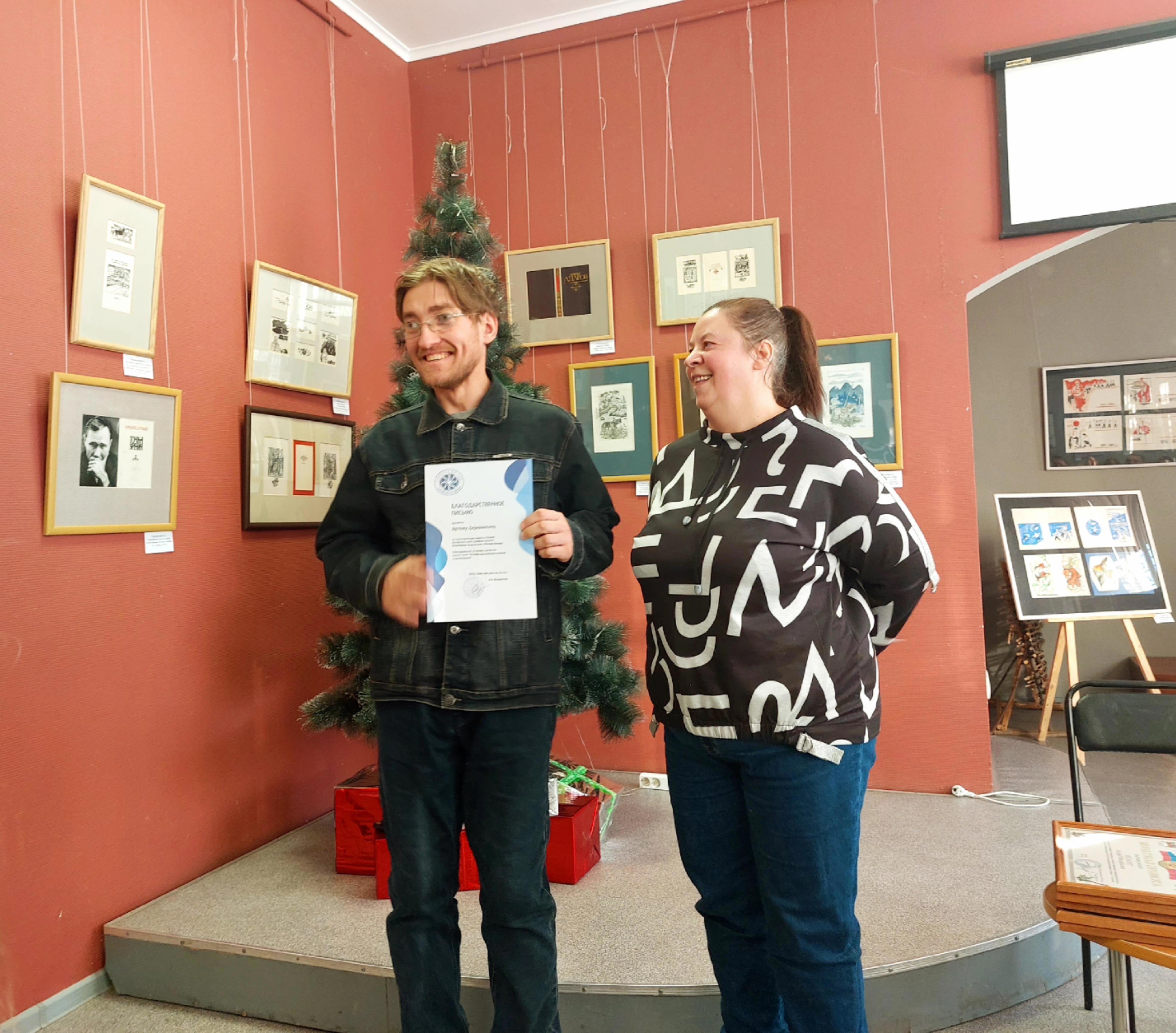 Руководитель писательской организации Анна Самойлова вручает Благодарственное письмо молодому поэту Артёму Деревянкину