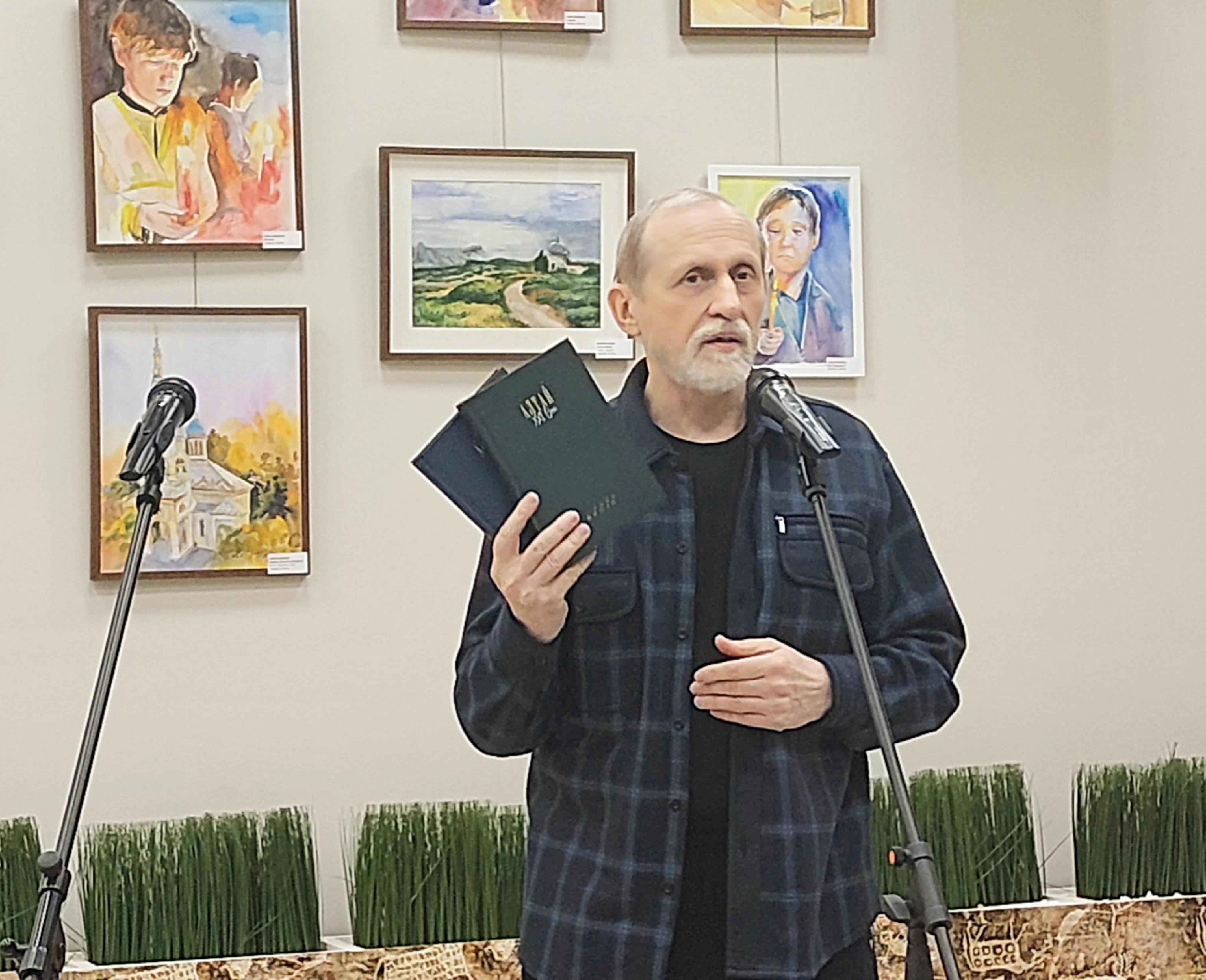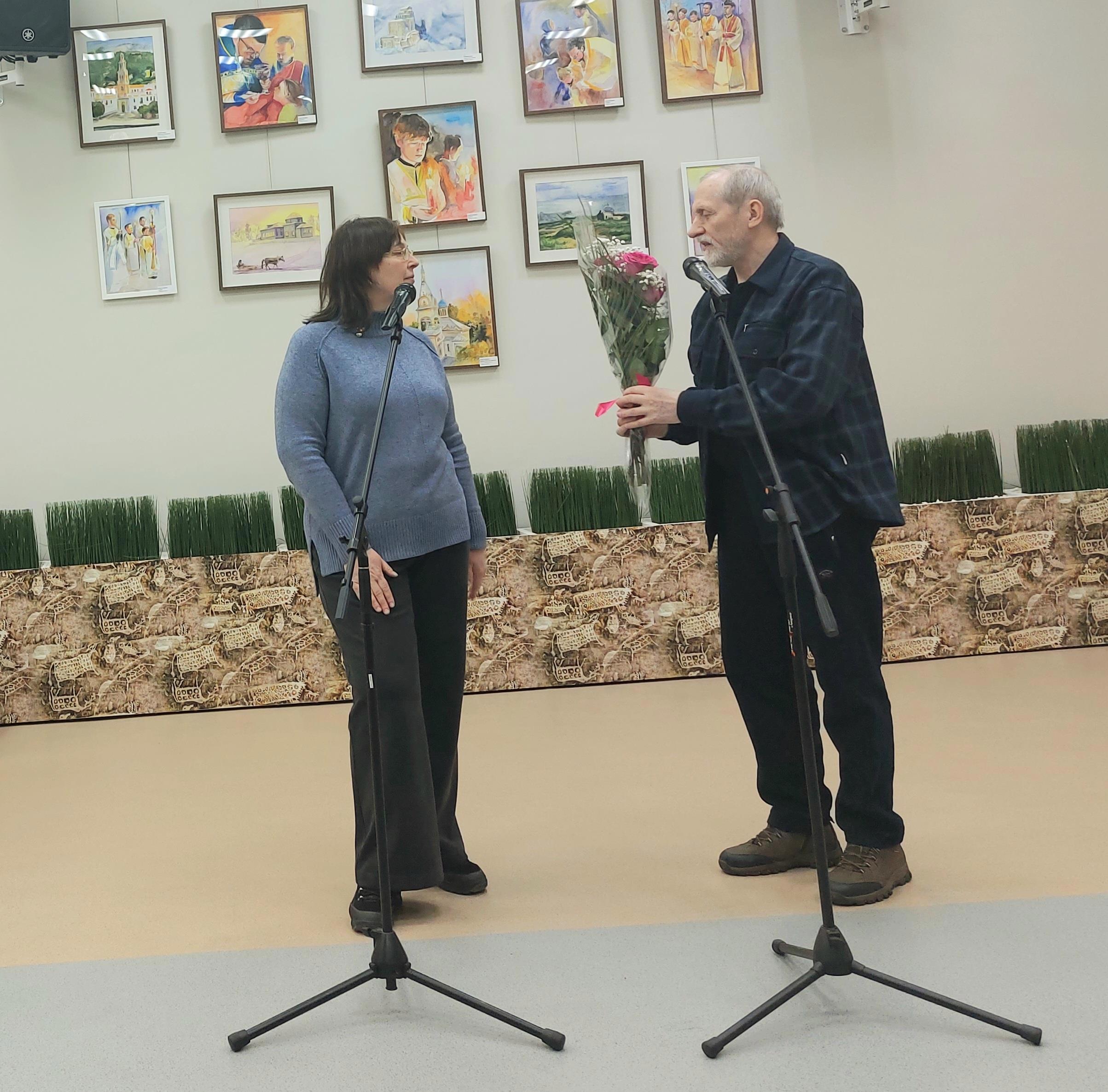 Поэт Валерий Котеленец вручает цветы Ларисе Вигандт 💐