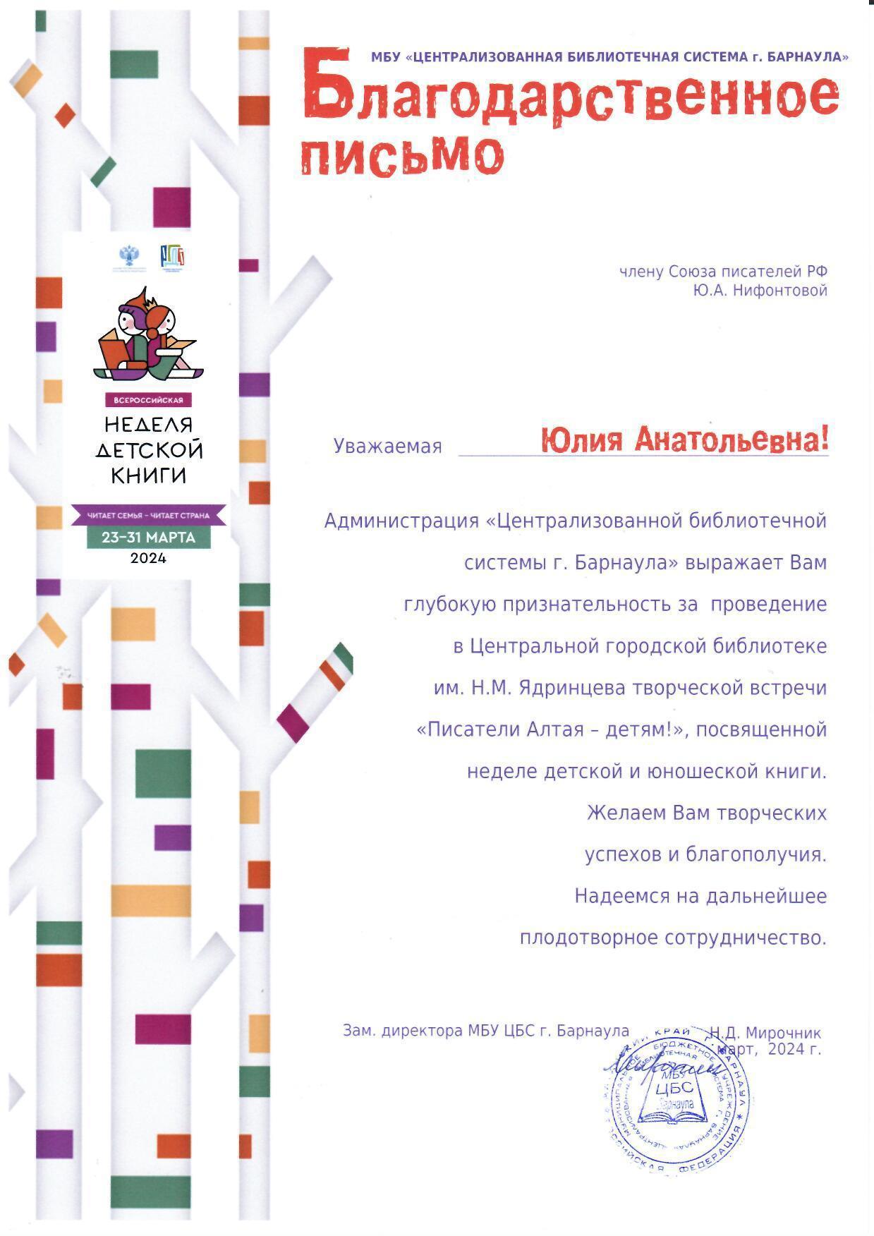 от Центральной библиотечной системы г. Барнаула за проведение в библиотеке им. Н. Ядринцева творческой встречи «Писатели Алтая – детям!»;
