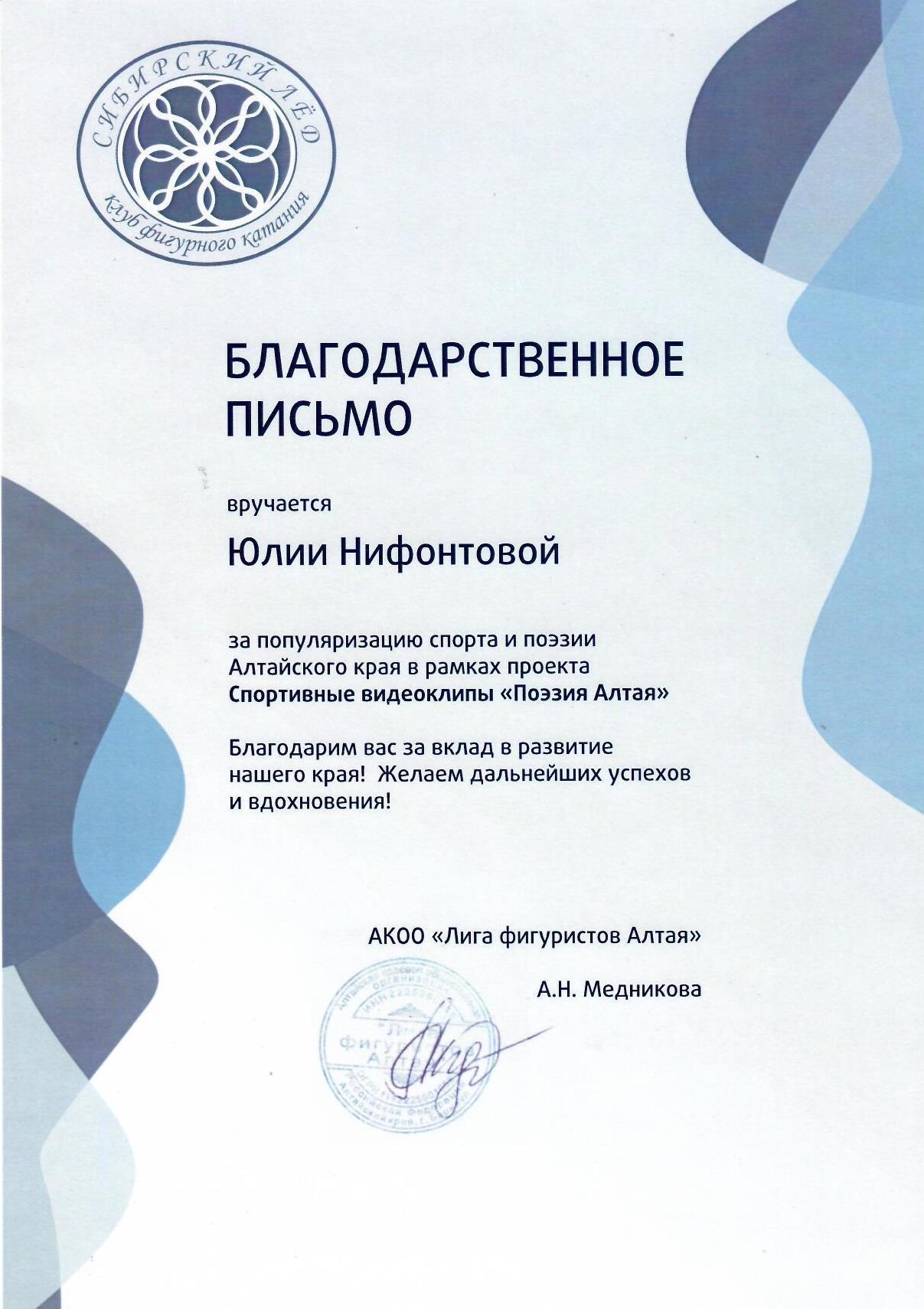 и самое неожиданное (!) – от Лиги фигуристов Алтая за популяризацию спорта и поэзии в рамках проекта «Спортивные видеоклипы ʺПоэзия Алтаяʺ»;