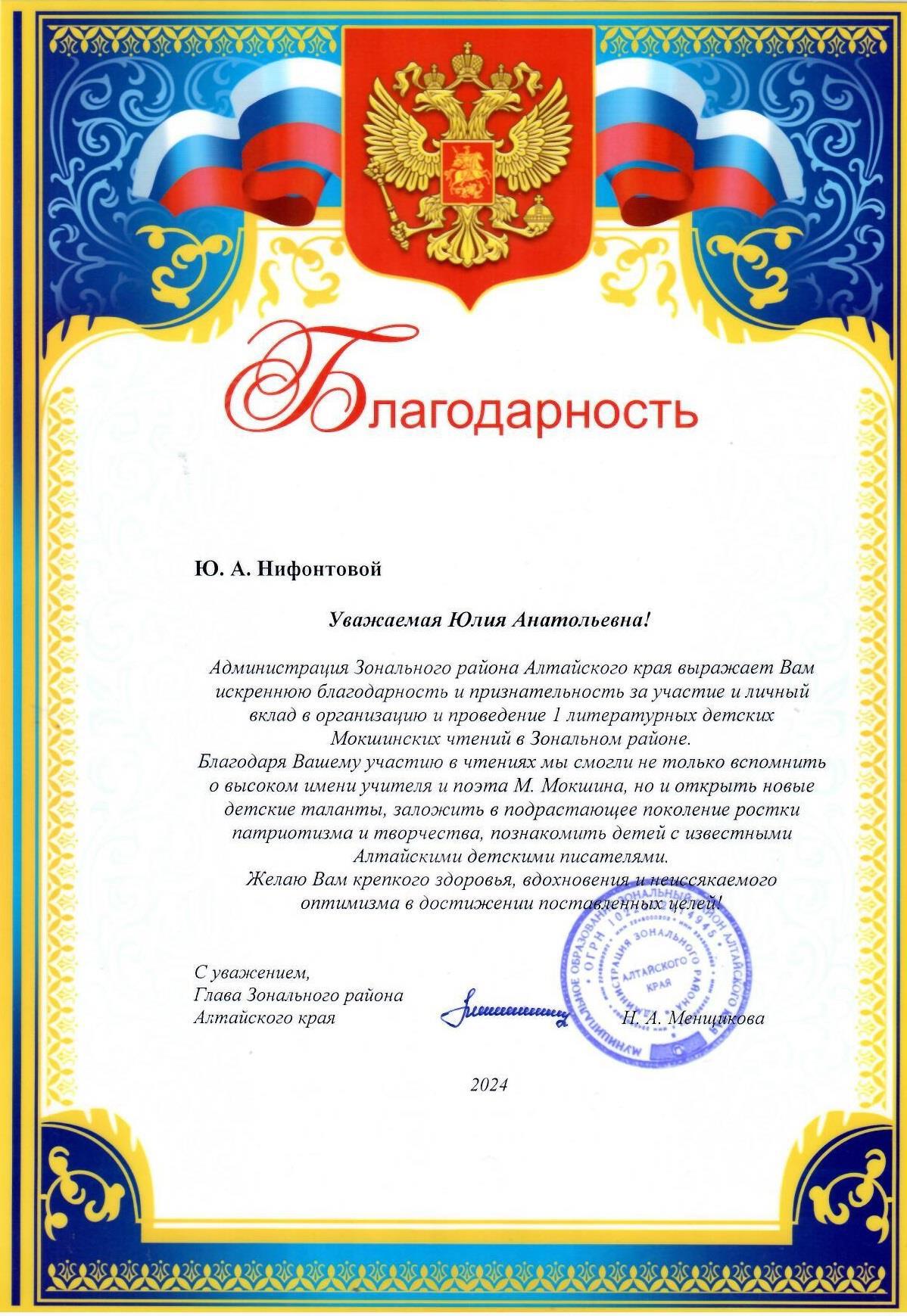 от администрации Зонального района Алтайского края за участие в I краевых литературных детских чтениях им. М. Мокшина;