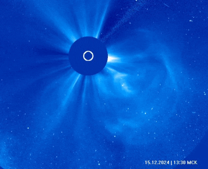Выброс плазмы из оторвавшегося протуберанца (в центре кружок — это закрытое шторкой Солнце, чтобы не «ослепить» камеру) — мы видим, что облако плазмы уходит в сторону от Земли, но краешком нас все же потом чуть-чуть задело.