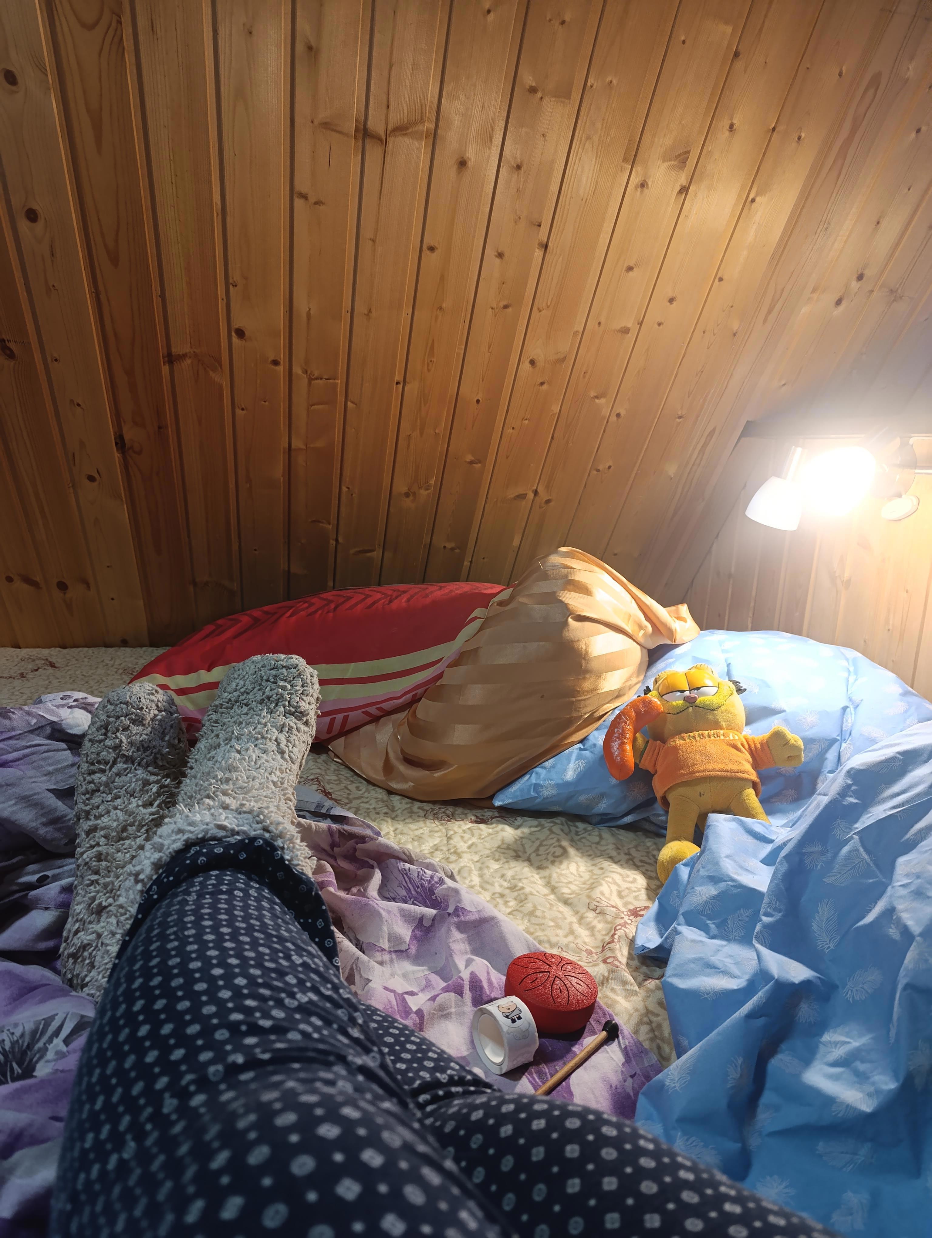 Лёжа на чердаке.