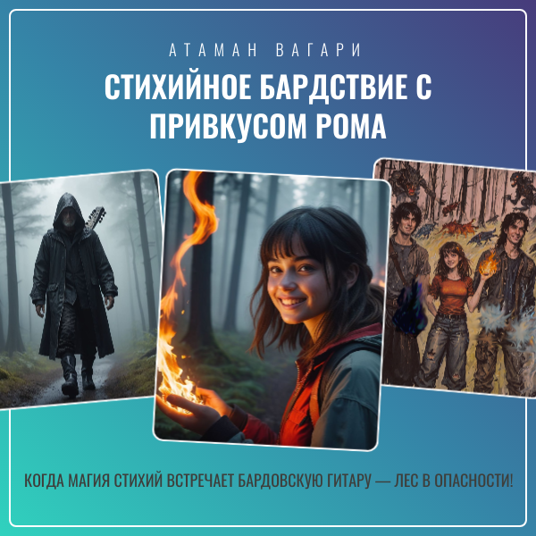 Автор: Атаман Вагари"Стихийное бардствие с привкусом рома" — история о том, как группа магов устраивает волшебное и сумасшедшее бардствие в лесу, чтобы остановить Пожирателя Песен, уничтожающего добро и творчество. Герои сражаются с монстрами, раскрывают тайны, учатся доверять друг другу и спасают мир — с ромом, музыкой и неожиданными поворотами!
