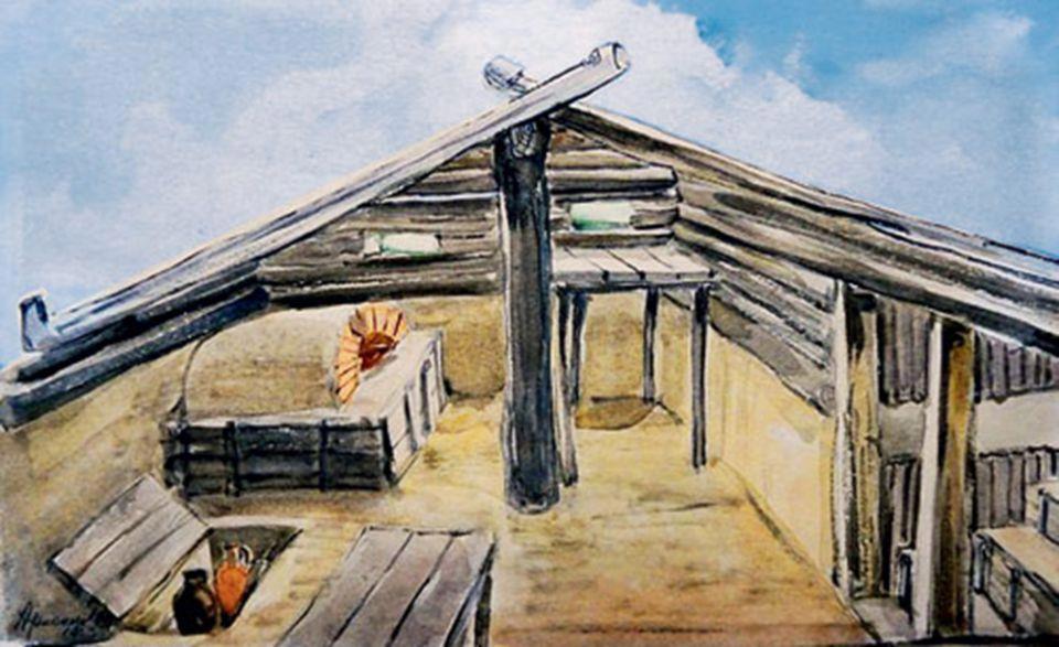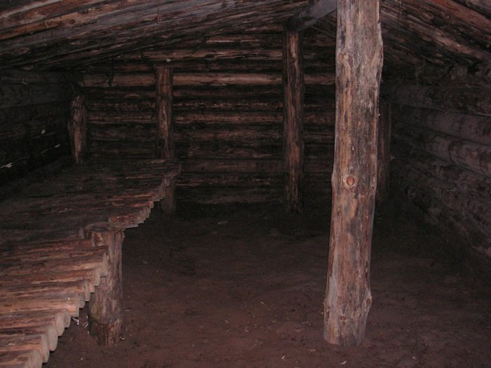 Реконструкция внутренности землянки. Как правило - нары для сна и там уж что получится, очаг или печка для обогрева. На реконструкции еще и погребок со столом нарисовали.