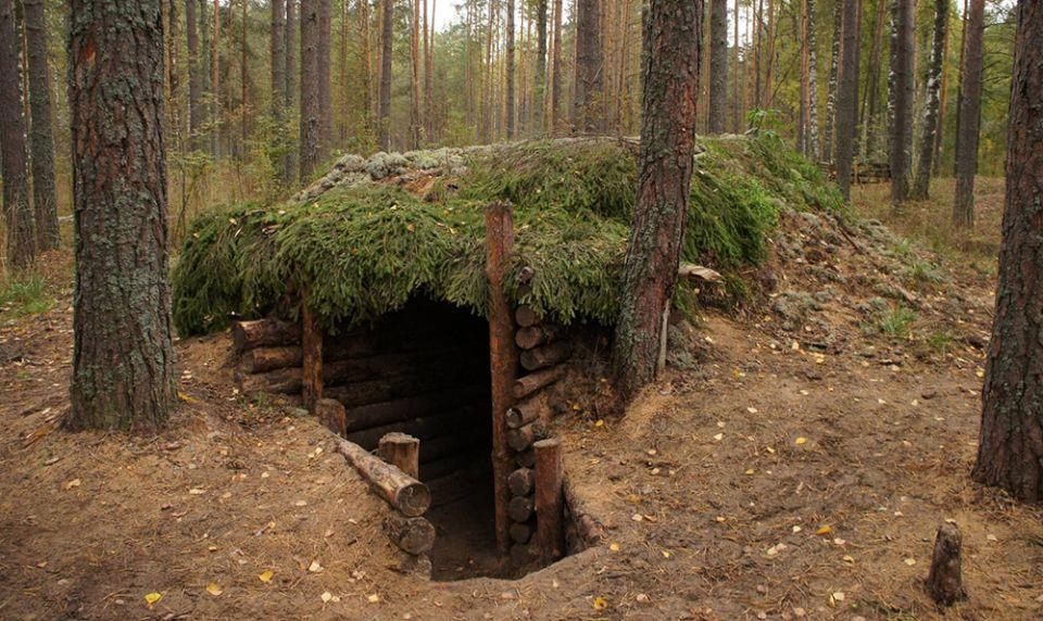 Эта - отечественная, охотничья внучка партизанской и фронтовой и послевоенной. когда немцы снесли все при отступлении, а жить где-то надо. Тут явно поспешали - вместо дерна крыша покрыта еловым лапником.