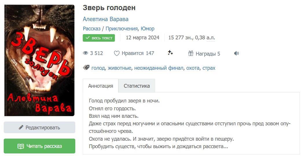 Автор: Алевтина Варава...поднимался едва уловимый гнилостный аромат. Туша уже начала разлагаться. Другой, острый и режущий ноздри запах доносился из разверстого чёрного зева. По спине зверя пробежался страх, шерсть вздыбилась.