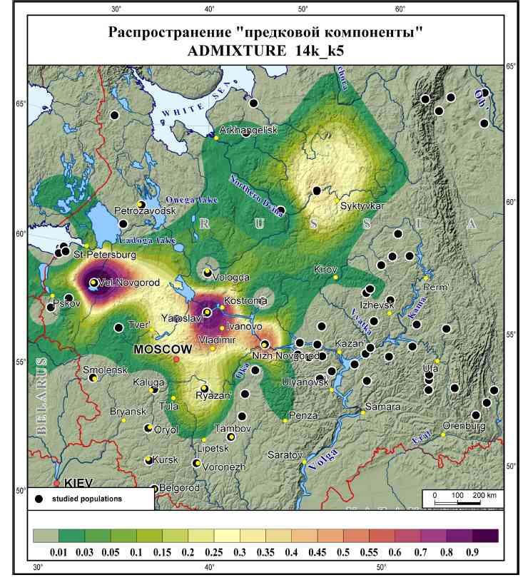 При переходе на большее число предковых компонент (k = 14) средний вклад «новгородской» предковой компоненты в русские генофонды резко снижается с 34% до 5%. Помимо новгородской он остается в трех популяциях: Ленского района Архангельской области, Кашинского района Тверской области, Михайловского и Спасского районов Рязанской области. В Ленском районе Архангельской области все обследованные индивиды, кроме одного, несут «новгородскую» предковую компоненту (в среднем — 50% генома). Это говорит о неслучайном сходстве этой популяции с новгородской, указывая или на массовую миграцию, или же на древний, общий с населением Новгородчины генетический пласт. В Кашинском районе Тверской области, напротив, «новгородская» предковая компонента обнаружена лишь у трех человек, но составляет 80-100% их геномов, это указывает на включение в популяцию лишь отдельных мигрантов из новгородских земель. Аналогичная небольшая миграция фиксируется в Рязанской области: в двух случаях — 100% «новгородской» компоненты, в одном — 50%. Таким образом, только в Ленском районе Архангельской области обнаружен массовый генетический новгородский след, хотя и север Тверской области, Рязанская и Нижегородская области вовлечены в сферу влияния новгородско-ярославского генофонда