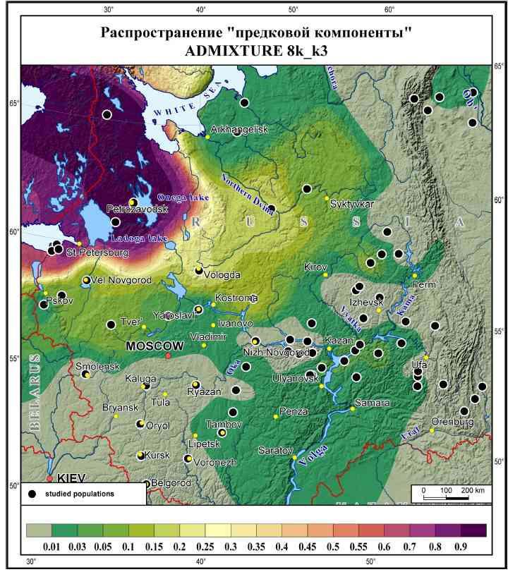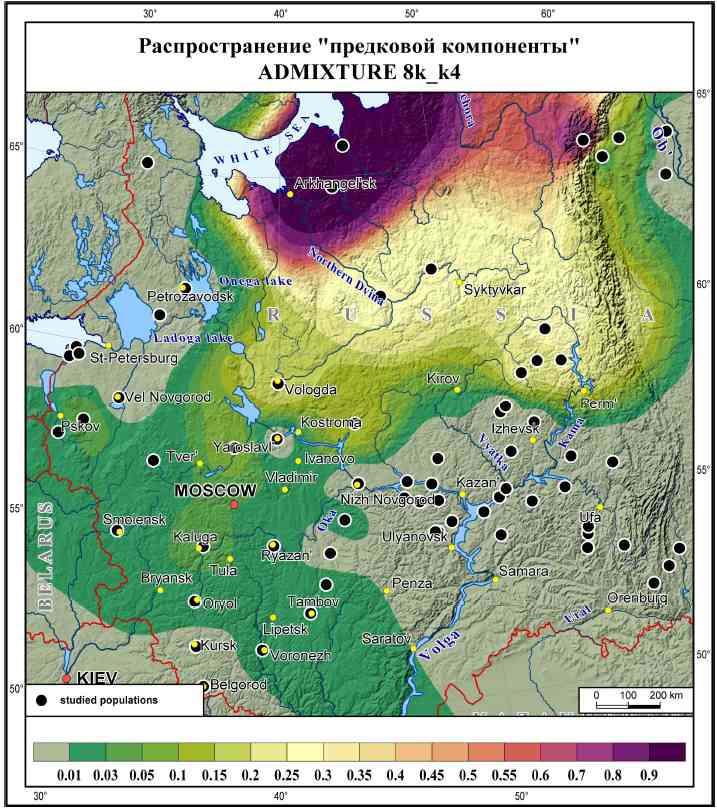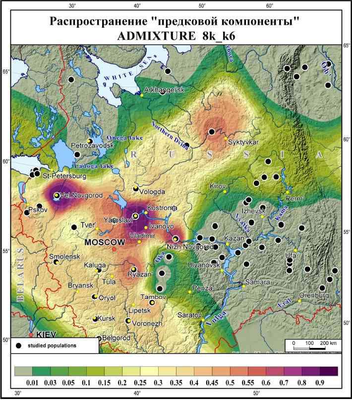Чтобы проверить эти гипотезы, авторы используют карты еще двух предковых компонент. Одна из них условно «поморская») наиболее характерна для северных русских популяций Архангельской области. Она убедительно демонстрирует, что Русский Север генетически отличен от Новгородчины, хотя исторически он очень тесно с ней связан.