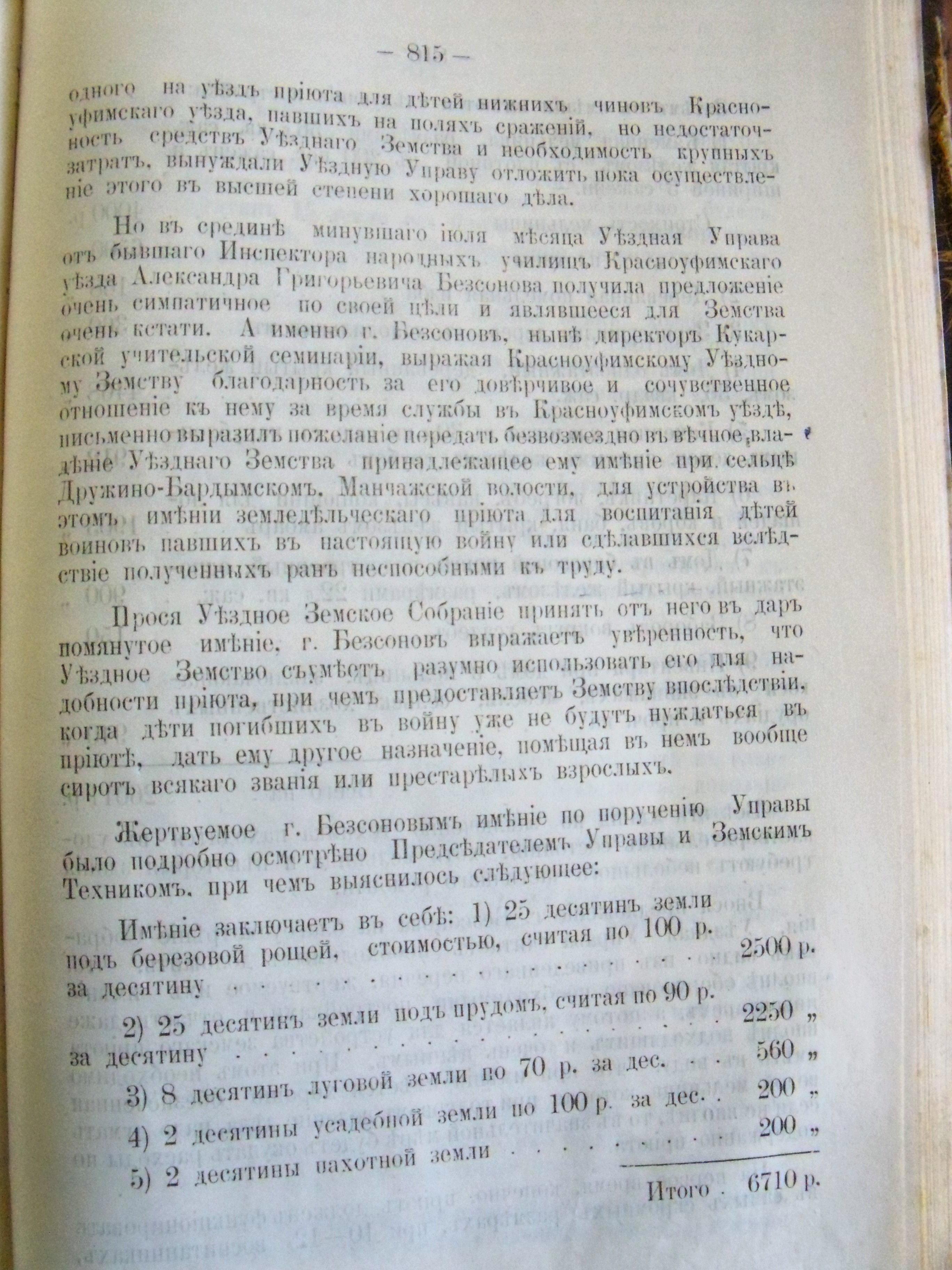 Общая стоимость земли составляла 6710 рублей. Кроме земли в имении были различные строения общей стоимостью 20011 рублей.