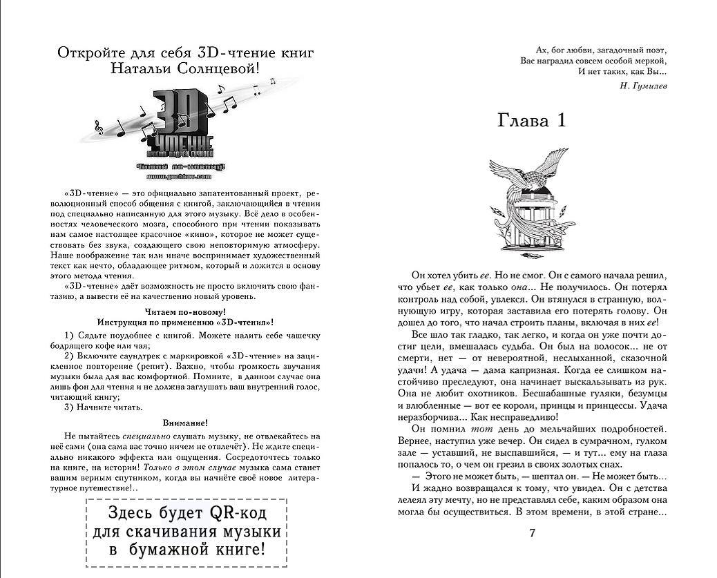 Каждый читатель, кто купит эту книгу, будет участником проекта «3D-чтение» и получит абсолютно новые эмоции. Для этого достаточно открыть роман, найти логотип проекта, с помощью QR-кода скачать музыку на свой гаджет, включить трек на повтор и, полностью погрузившись в книгу, перешагнуть в другую 3D реальность…