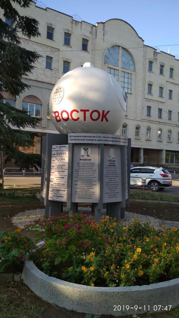 Наискосок от гостиницы "Новый свет" стоит небольшой памятник космической программе СССР. В Крыму наши космонавты тренировались, лечились и отдыхали. Здесь же был полигон, на котором отрабатывали управление луноходом и вторая площадка связи ЦУПа. В Феодосии так же находилось несколько центров, которые принимали космонавтов и конструкторов ракет.