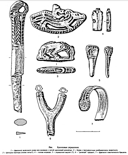 Также при раскопках был найден богатый вещественный материал: железные и костяные наконечники охотничьих стрел, рыболовные крючки, железные ножи различной формы, ручки котлов, железные, бронзовые и серебряные украшения. Украшения, такие как подвески, пластины, браслеты, кольца, бубенчики, якорные и шумящие подвески - исполнены в "пермском зверином стиле" и относятся к финско-угорской культуре.