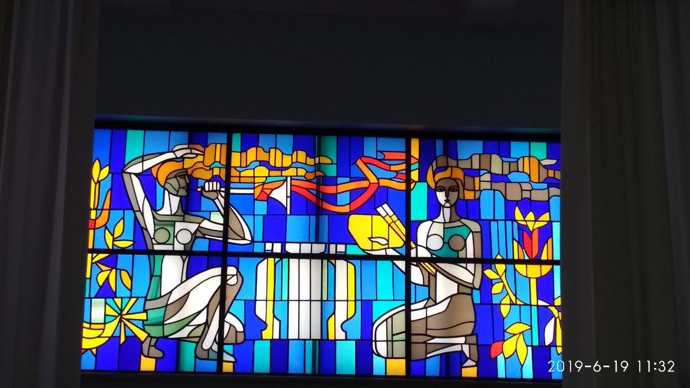 Но больше всего порадовал восстановленный витраж, который был сильно повреждён. Его восстановили. Как сказала работница Дворца культуры, с ним реставраторы бились почти год. Труднее всего было найти фотографии, чтобы понять как выглядел витраж в изначальном виде. Ну, а сварить стекло и воссоздать утерянное было делом техники.