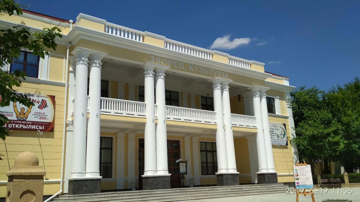 Здание в стиле советского ампира построено после войны. Строился как клуб санатория "Восход". До возвращения Крыма в Россию имело очень печальный вид, не хуже ещё не отреставрированных дач. Гулять возле него было просто опасно. Несмотря на это, в бывшем клубе круглый год шла торговля всякими благовониями и бижутерией. Помнится, проходя мимо бывшего клуба в первый раз, нас чуть с ног не сбило мощной волной восточных ароматов. Затем его несколько лет реставрировали и чинили. Жители Феодосии волновались, что будет в обновлённом дворце культуры. И были просто потрясены, что он там и остался.