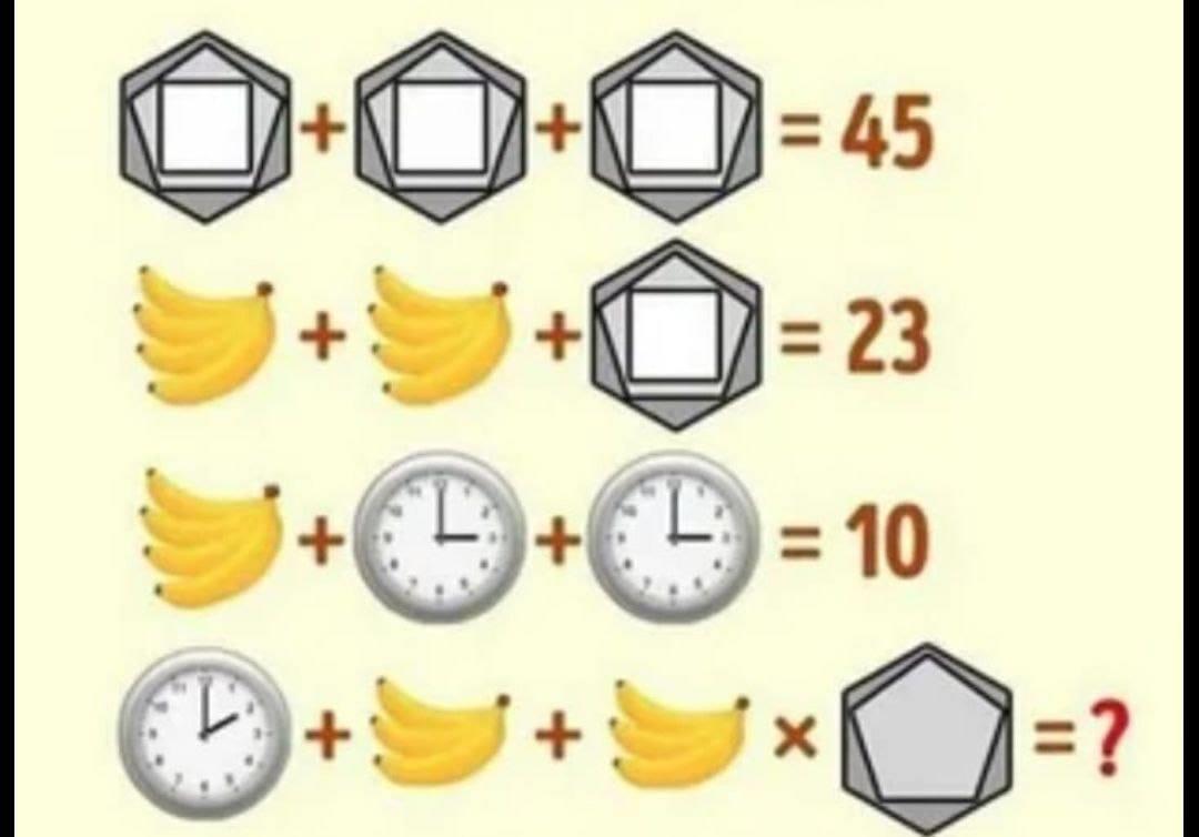 2. Рассмотрим второе уравнение. Третий член - знакомая нам фигура с 15 углами. Вычитаем 15 из 23 и получаем 8. Приходим к умозаключению что одно изображение грозди бананов равно четырем. И снова замечаем что именно столько бананов нарисовано в грозди. То есть - считаем бананы.
