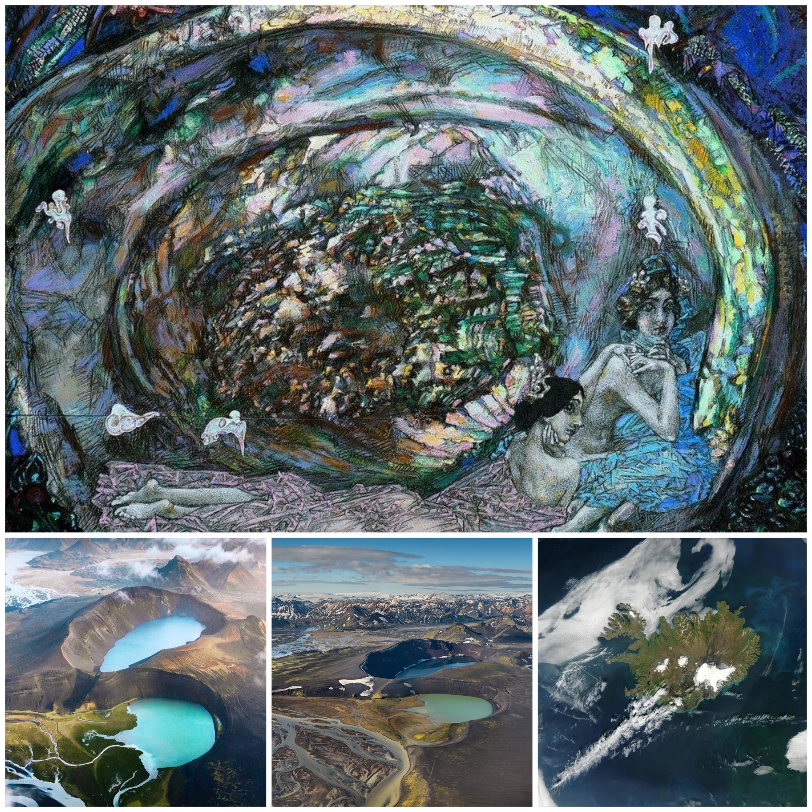 Некоторая мрачность врубелевских картин меня не пугает и ассоциируется с суровым климатом Исландии. Сумрачно, но в то же время невозможно отвести взгляд, настолько завораживает. И если рецензия у меня визуализировалась с картиной “Демон сидящий “, то сам сборник — с картиной “Жемчужина”. Пучина в центре приковывает внимание и не отпускает, как описания и рассказы Елены, в которые погружаешься полностью, захваченный нещадным исландским вихрем. Золотистые, пурпурные, сине-лиловые цвета Врубеля отражают колорит Исландии с её причудливым рельефом в оправе из двух океанов: вулканами, озёрами, лавовыми полями и чёрными пляжами, люпинами и низкорослыми лесами, гейзерами, водопадами и ледниками. Переливчатые грани льда, пламени, лавы Исландии, созданные природой, напоминают мне эффект перламутрового блеска в картинах Врубеля, в создании которого он достиг непревзойденного мастерства. Но невозможно превзойти саму Природу, которая одарит избранных редкой драгоценностью — изумительной красоты явлением — Северным сиянием.
