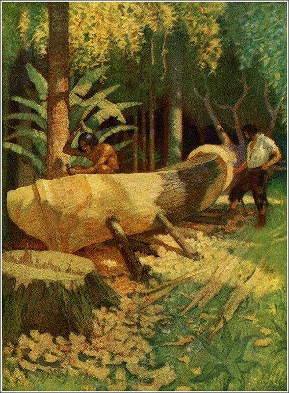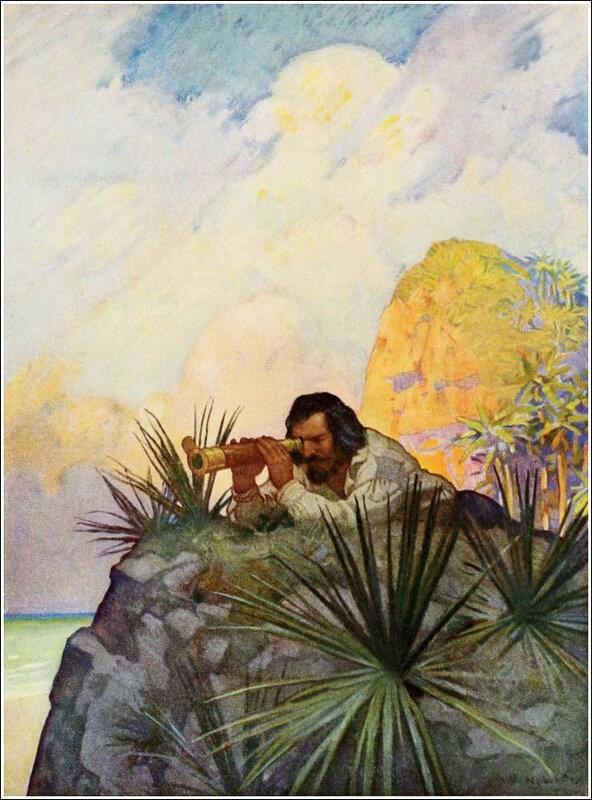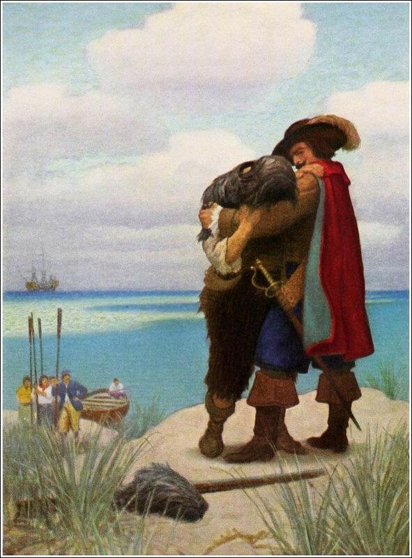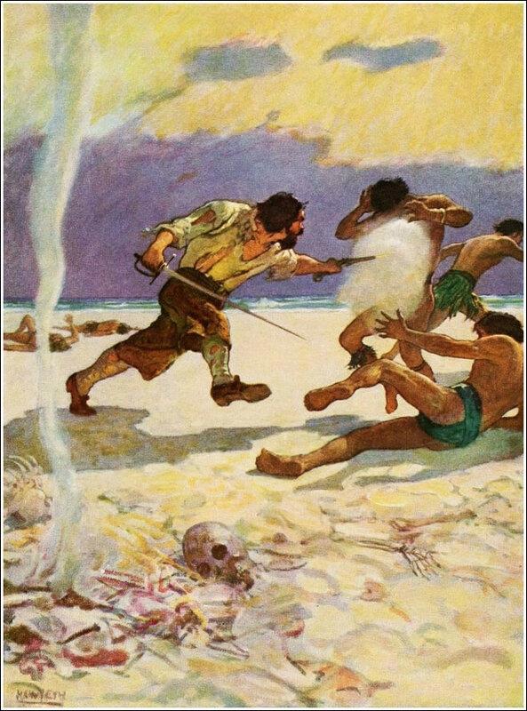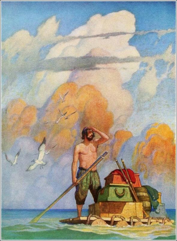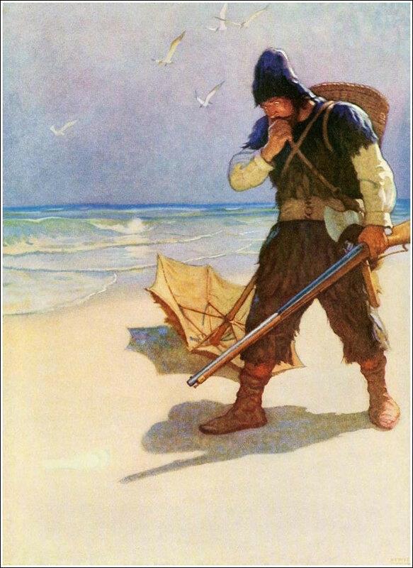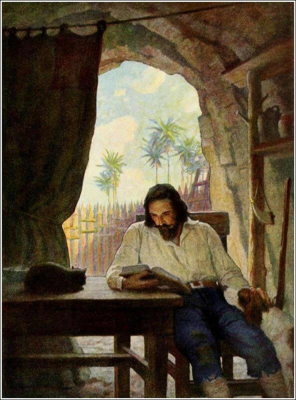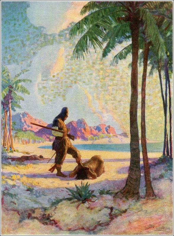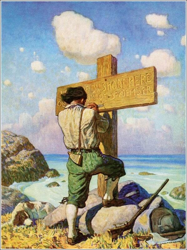 Ну и для атмосферы нарыл в интернете иллюстрации Ньюэлла Конверса Уайета к «Робинзону Крузо». В тех изданиях, которые читал ранее, были другие иллюстрации, от других художников (и все они были черно-белые). А тут получилось ярко и атмосферно)